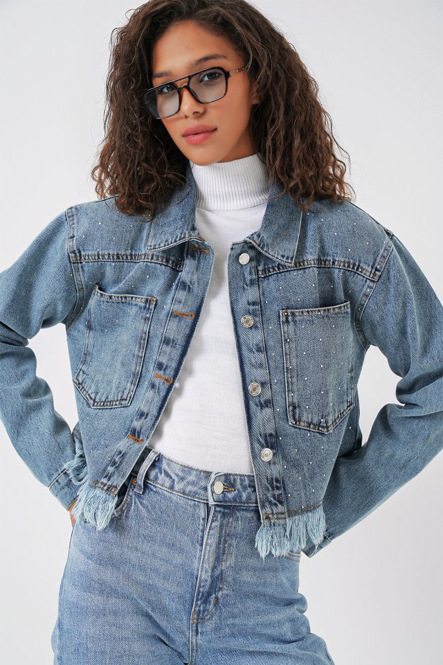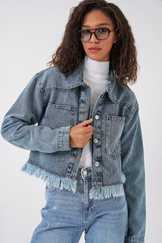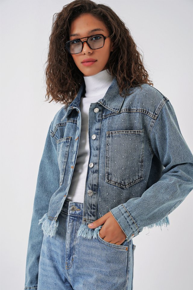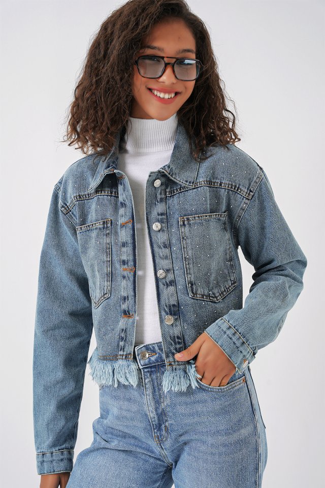 0716 Çift Cepli Crop Kot Ceket - Mavi