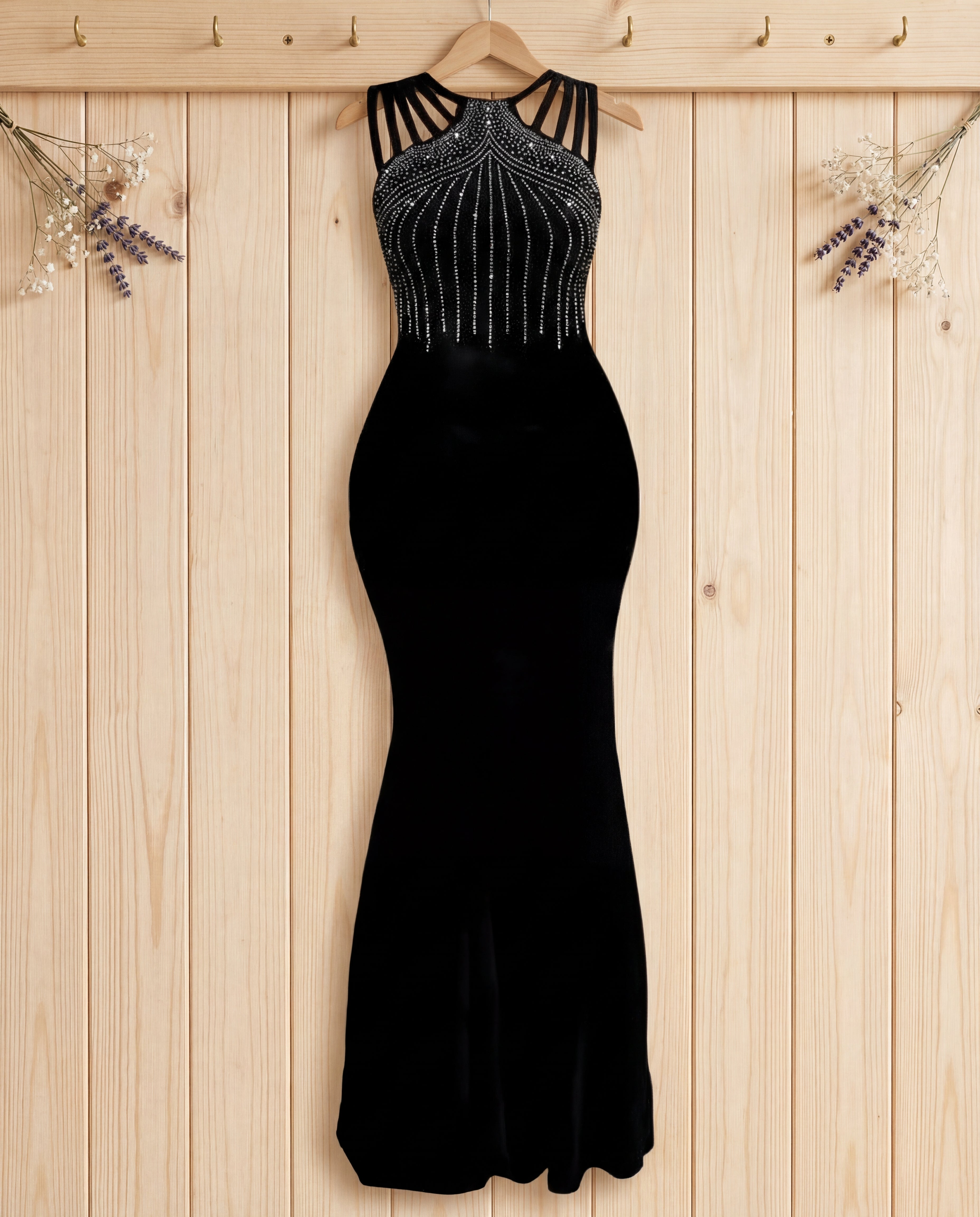 Kadın omuz çoklu askılı önü taş işlemeli balık kesim krep kumaş maxi boy elbiseBeden: S-M/L-XL/2XL-3XL