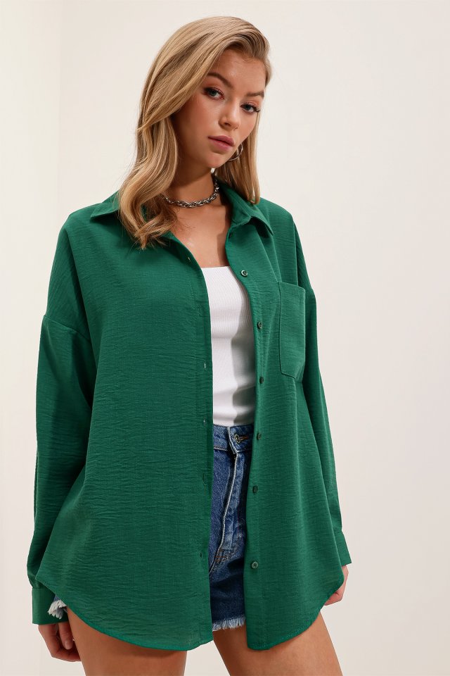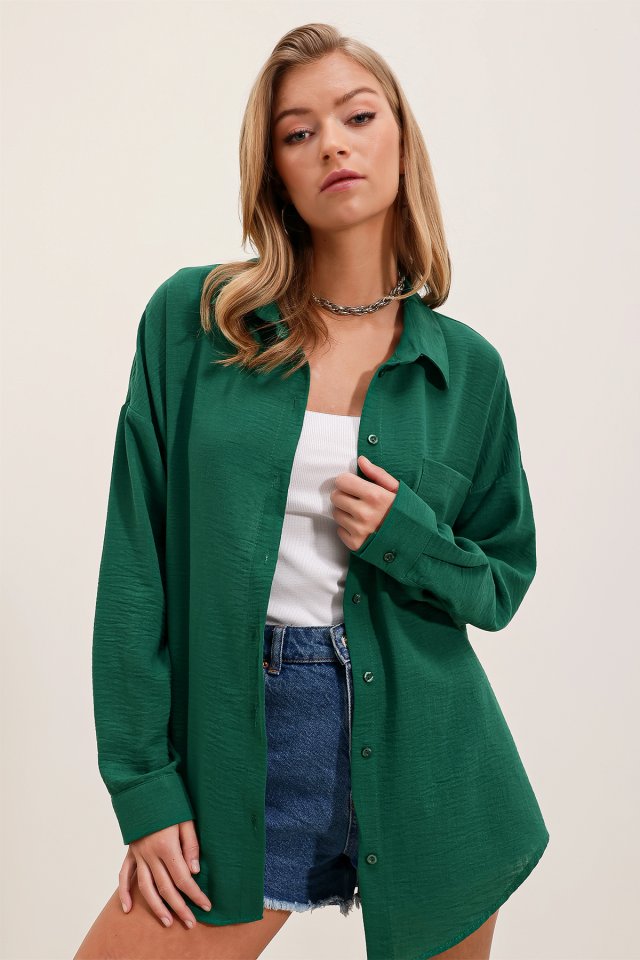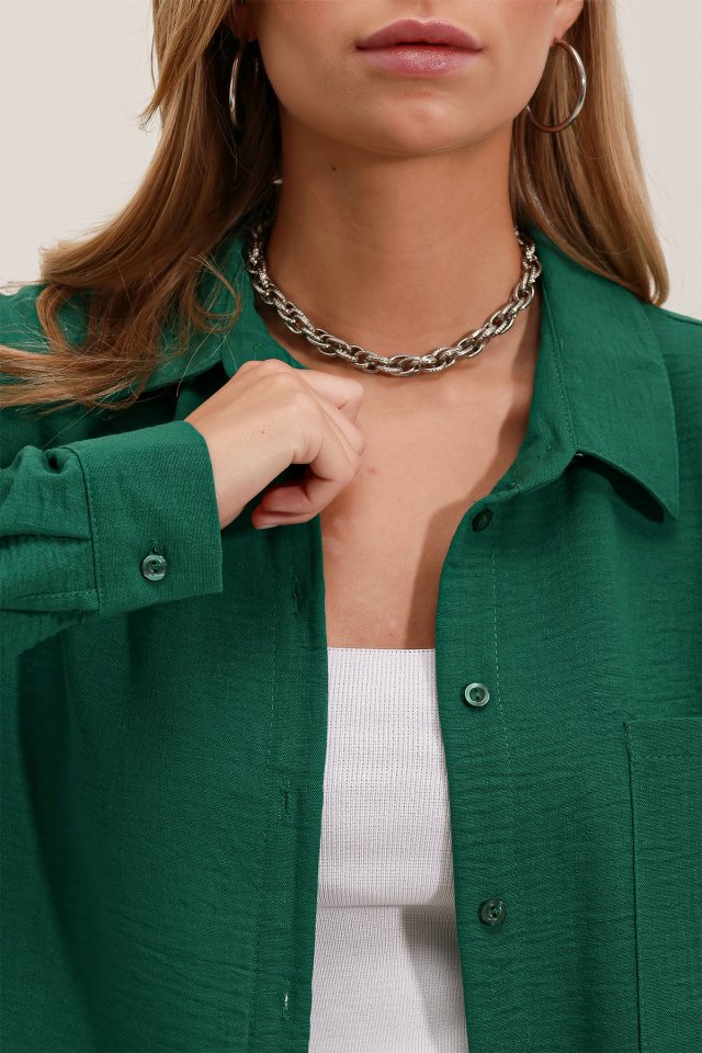 20153 Tek Cepli Oversize Keten Gömlek - Zümrüt Yeşili