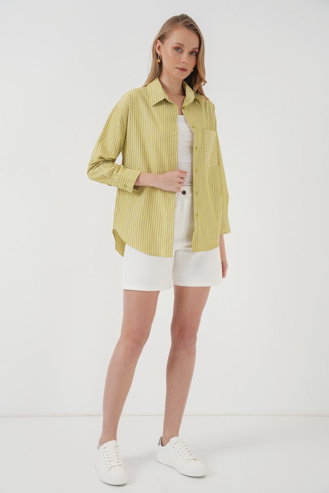 20205 Çizgili Oversize Gömlek - Yağ Yeşil