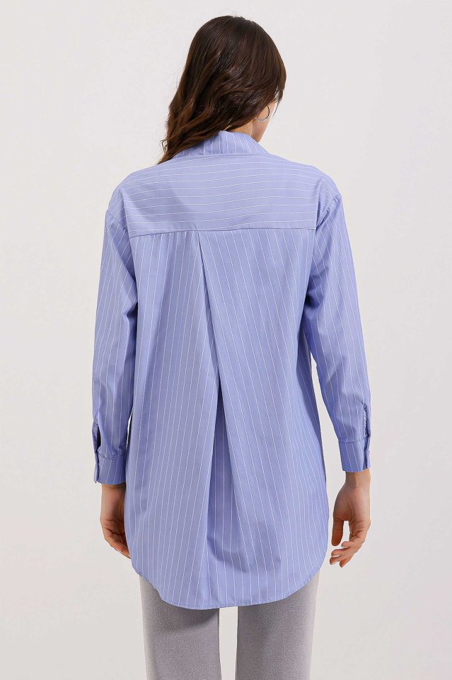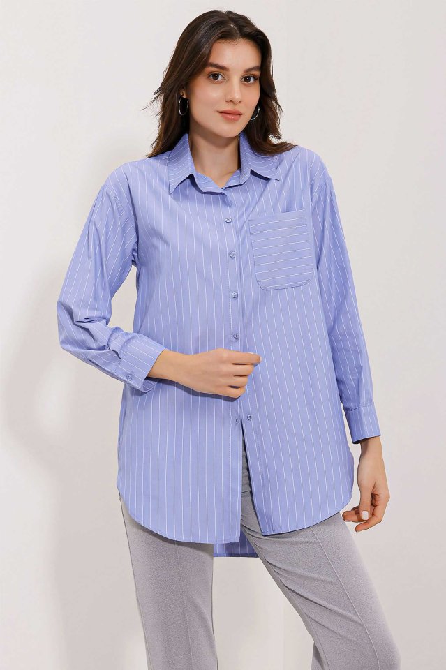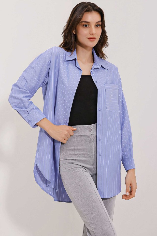 20217 Cep Detaylı Çizgili Oversize Gömlek - İndigo