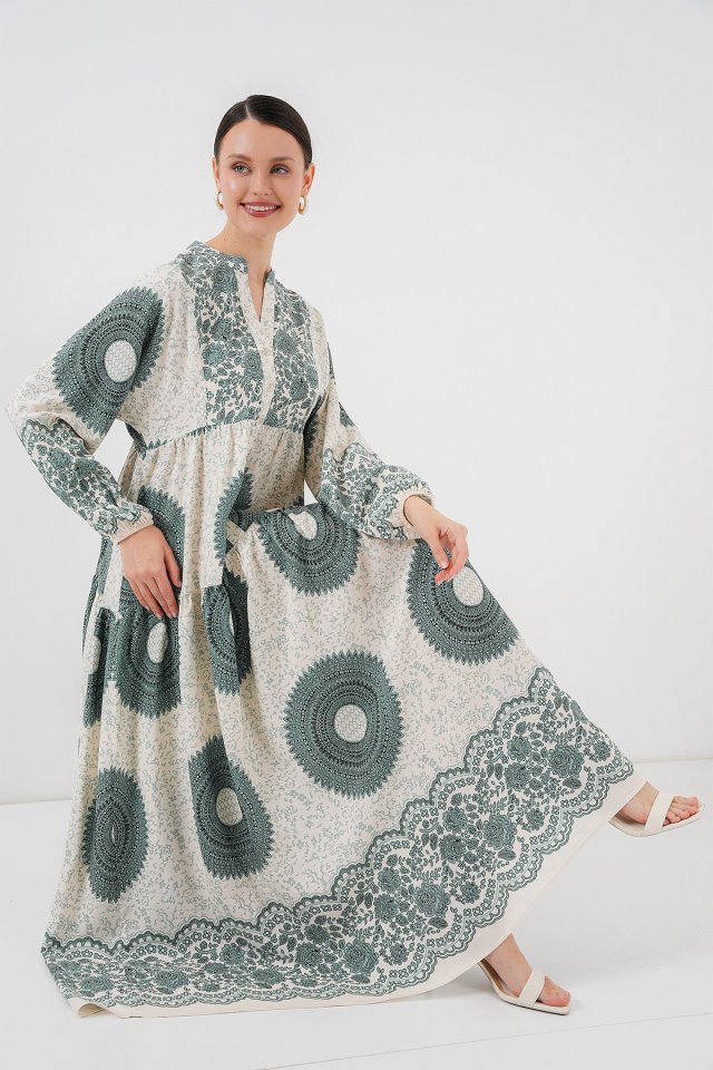 2423 Otantik Desenli Tesettür Elbise - C. Çağla