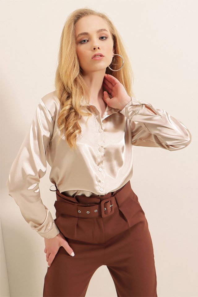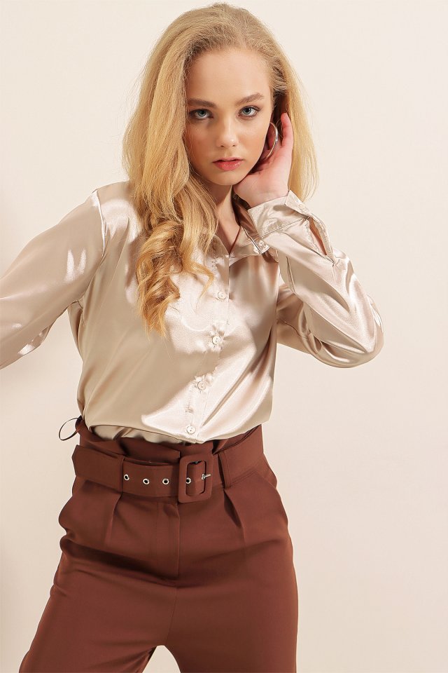 3964 Hafif Dökümlü Saten Gömlek - Bej