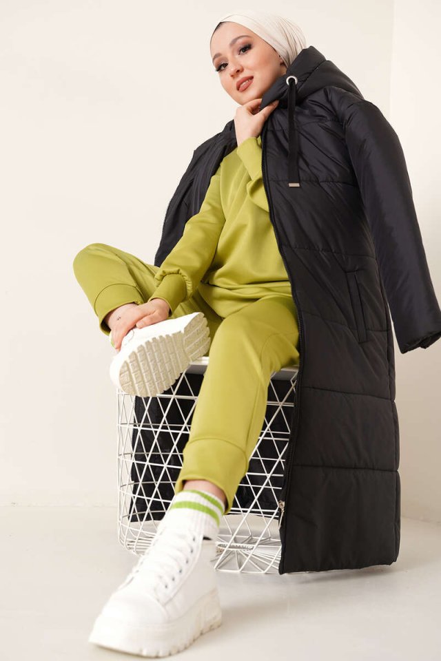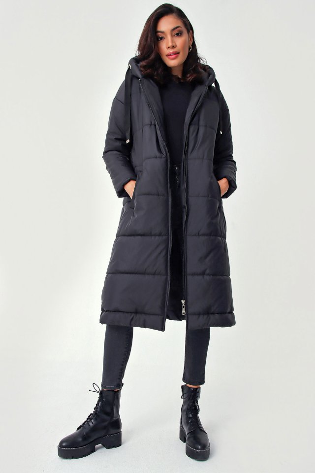 5120 Kapşonlu Uzun Şişme Mont - Siyah