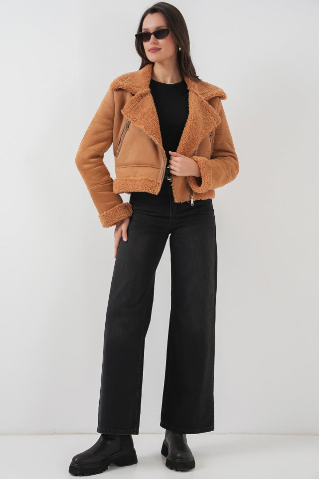 5155 Kruvaze Yaka Suni Kürklü Deri Mont - A.Kahve