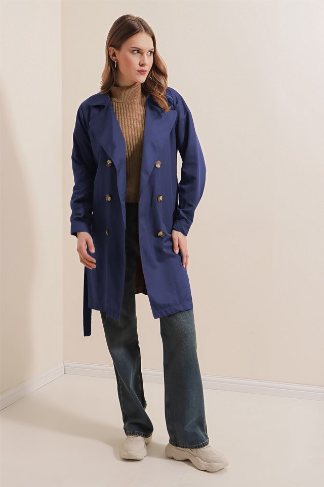 5864 Kruvaze Yaka Kısa Trençkot - Lacivert