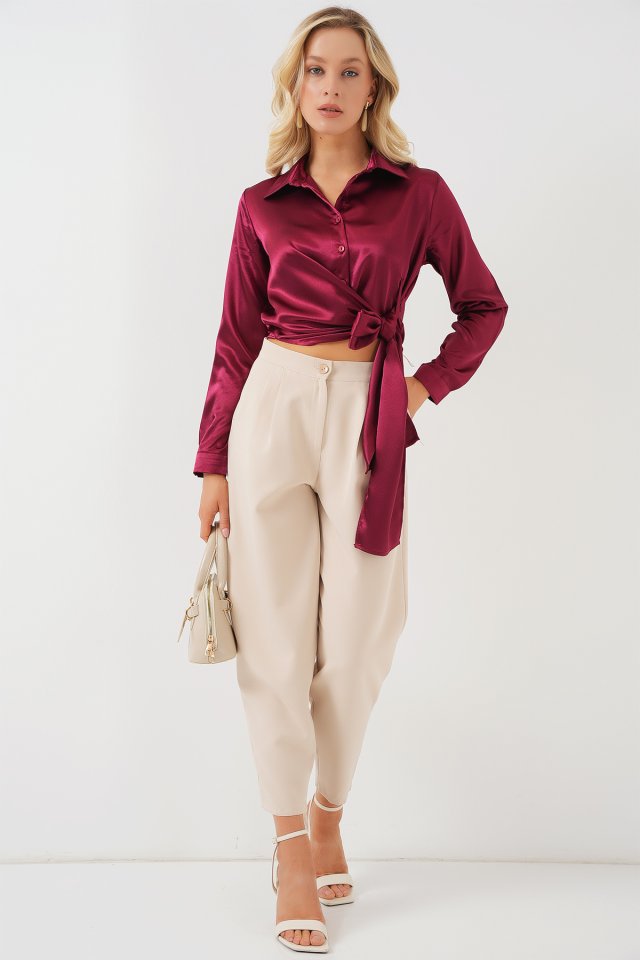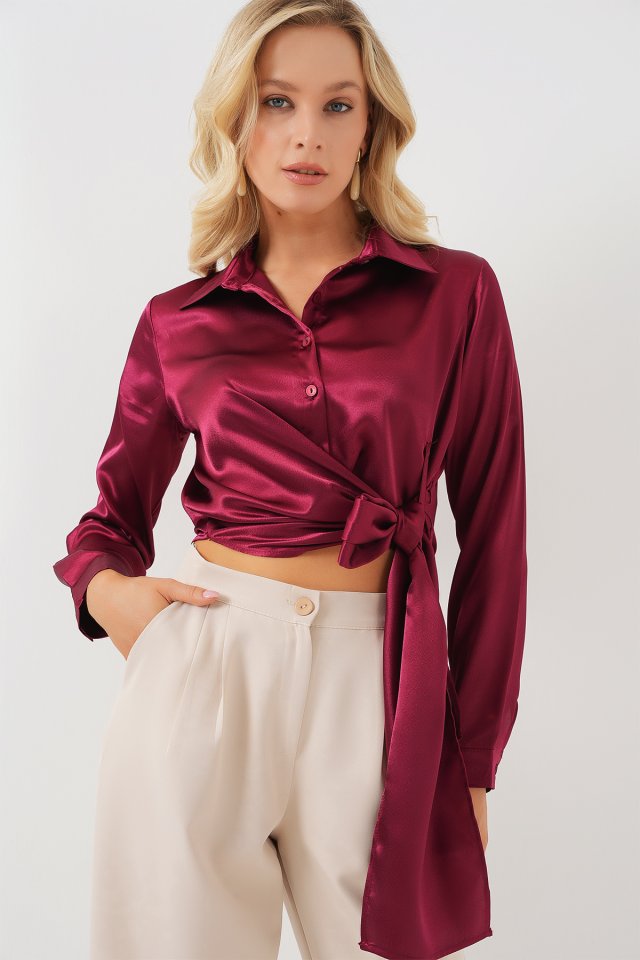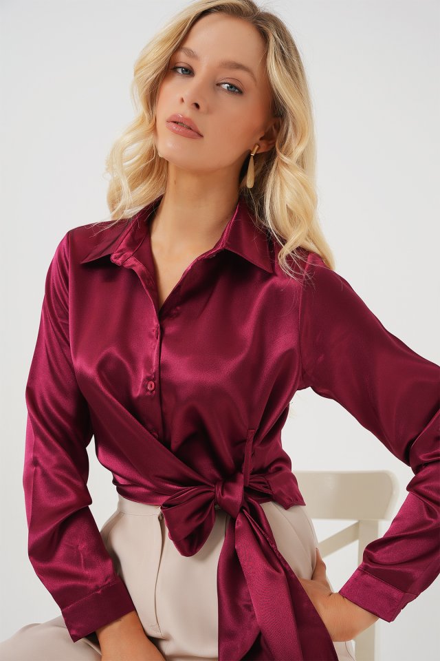 Bağlamalı Uzun Kol Saten Gömlek 20287 - Bordo