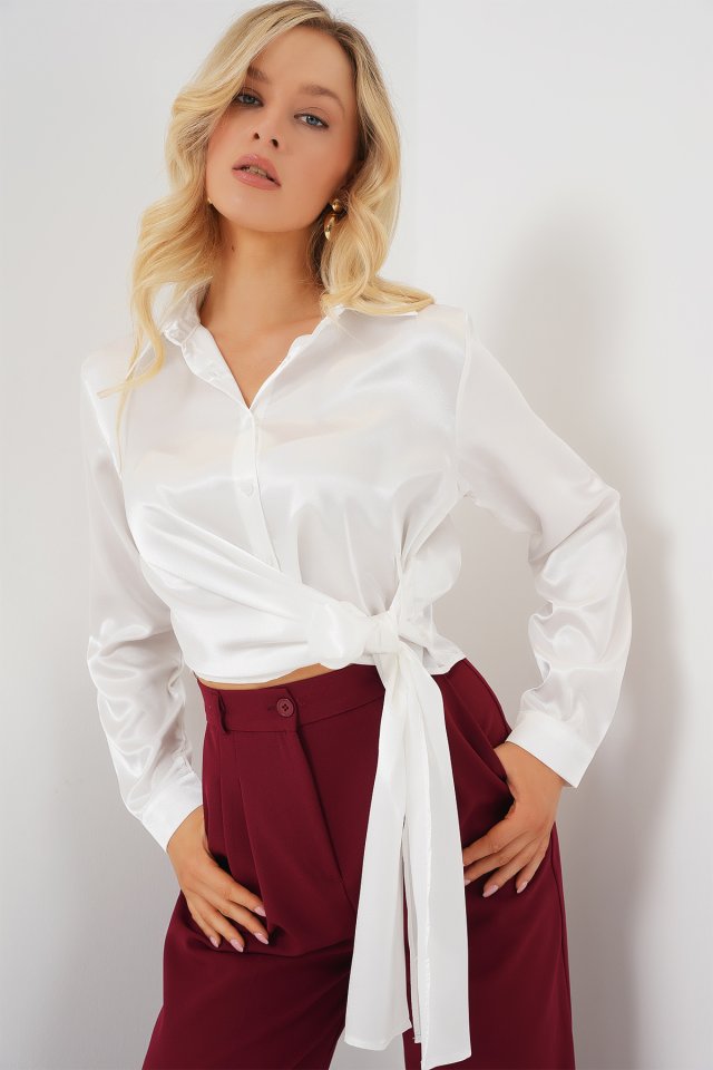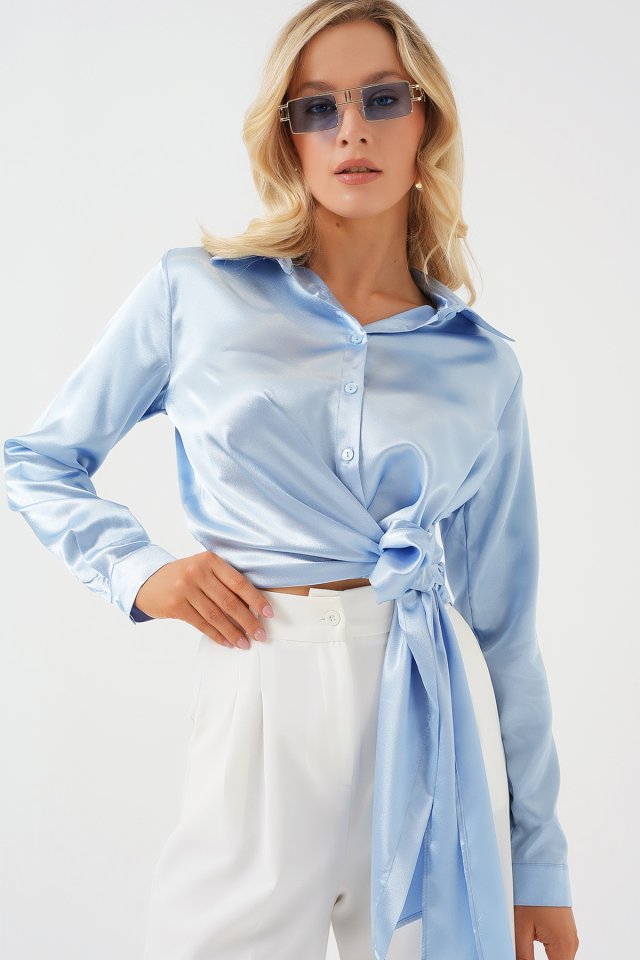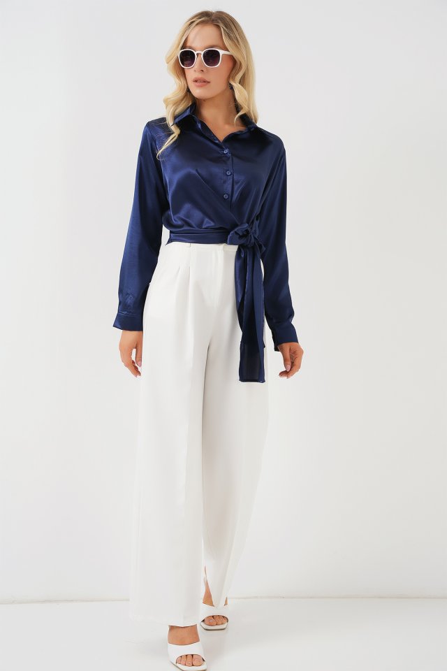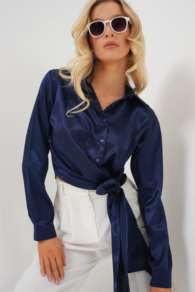 Bağlamalı Uzun Kol Saten Gömlek 20287 - Lacivert