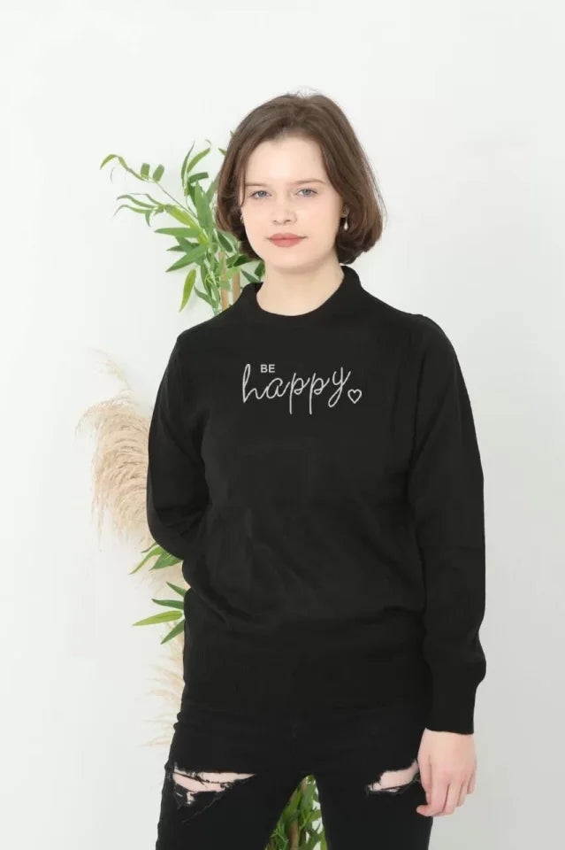 Baskılı Uzun Kol Yarım Boğazlı Dokuma Triko - Siyah