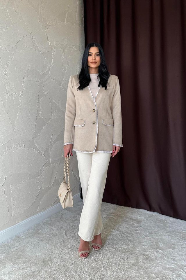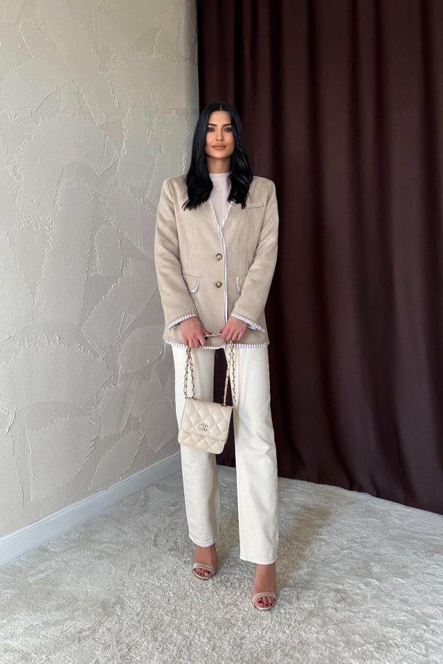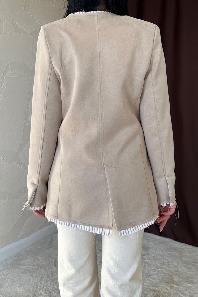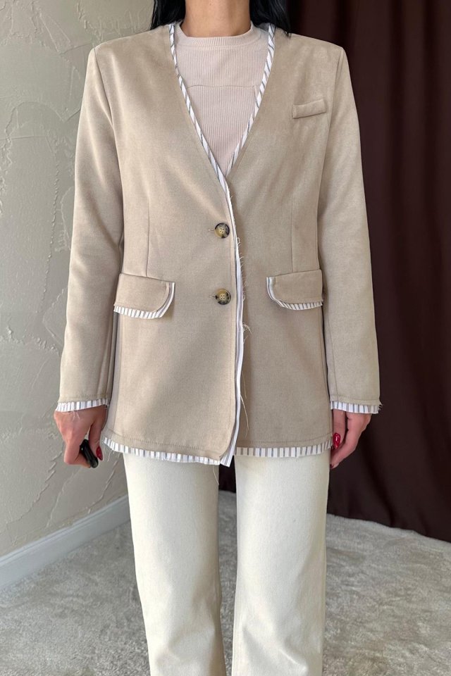 Bej Çizgili Astarlı Garnili Süet Ceket
