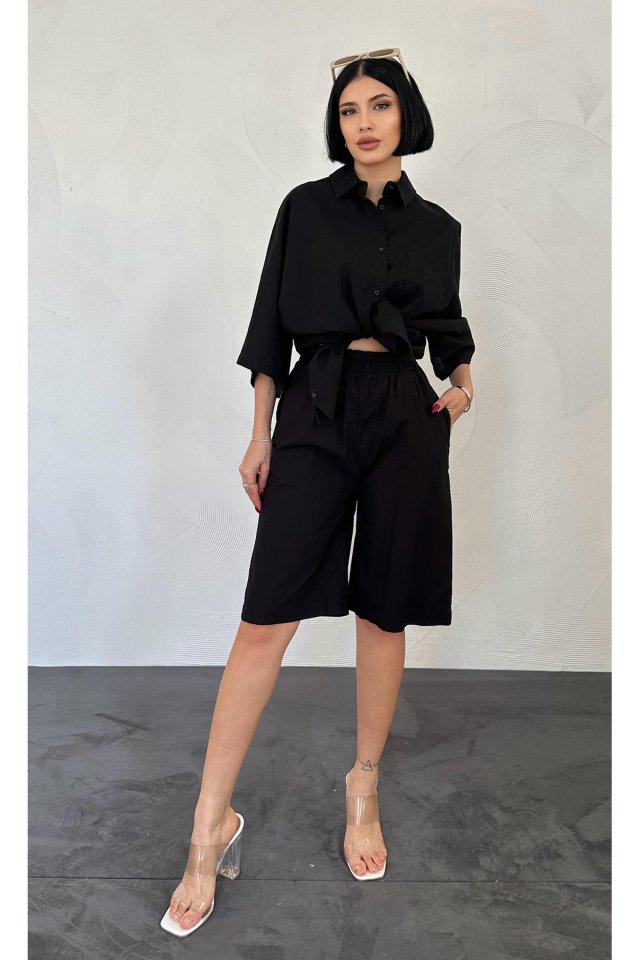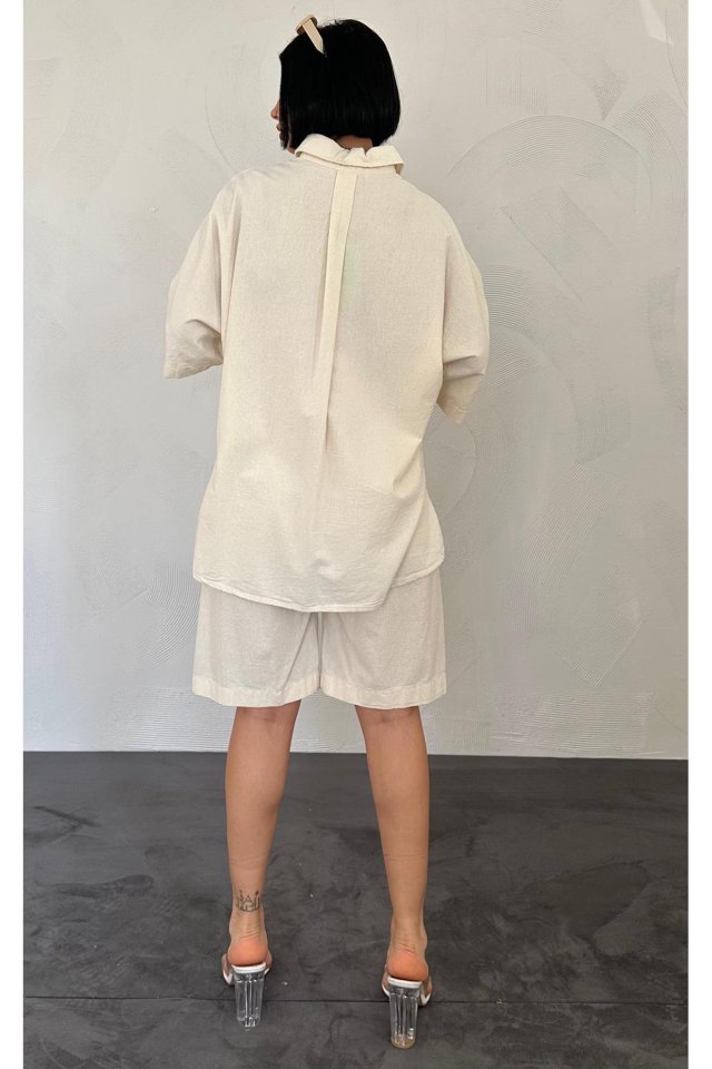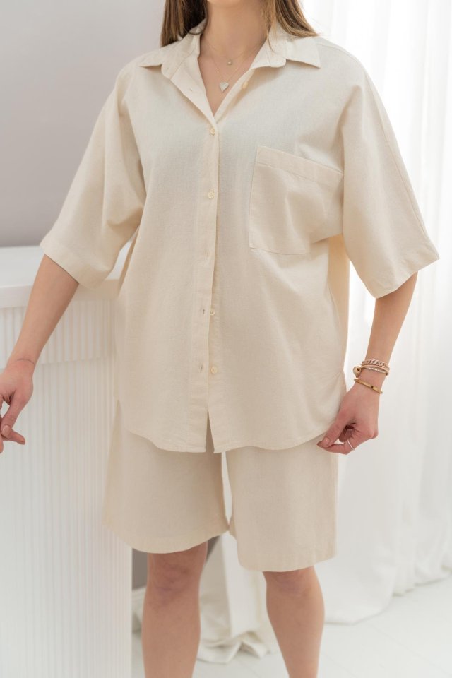 Bej Kısa Kollu Keten Gömlek Ve Şort Takım