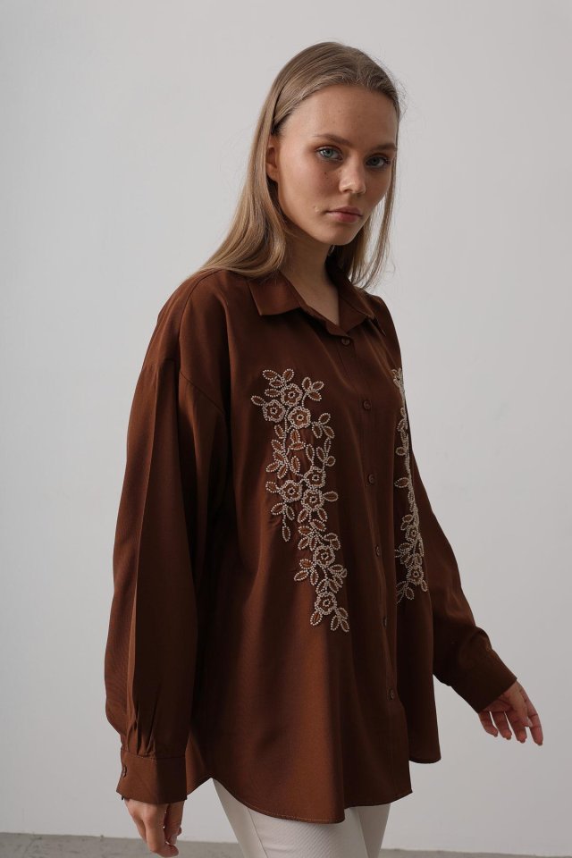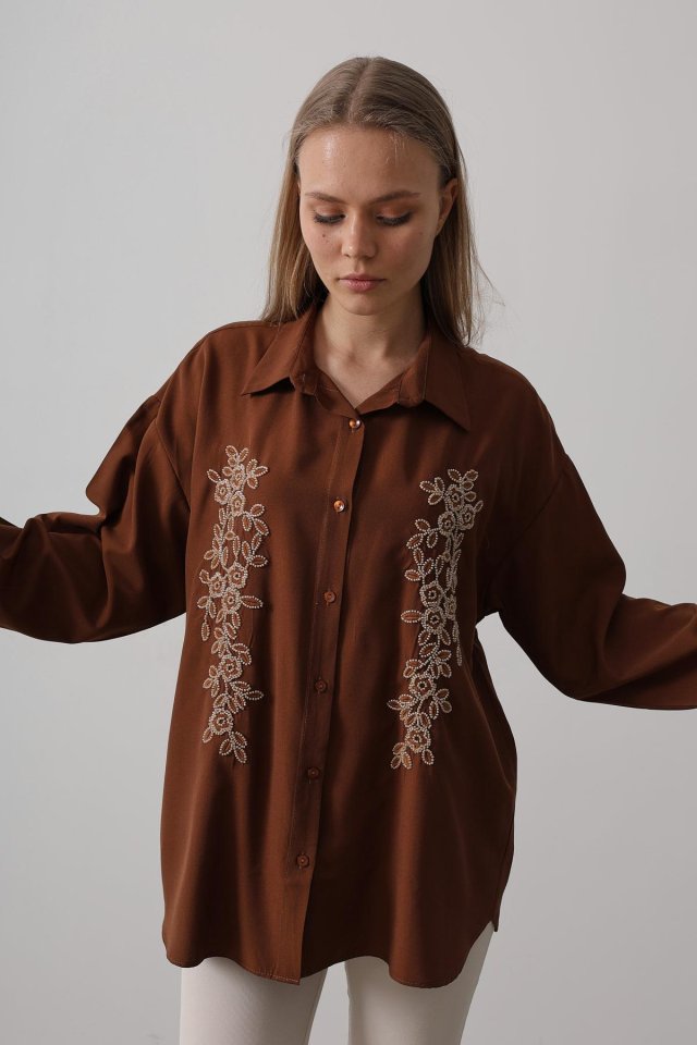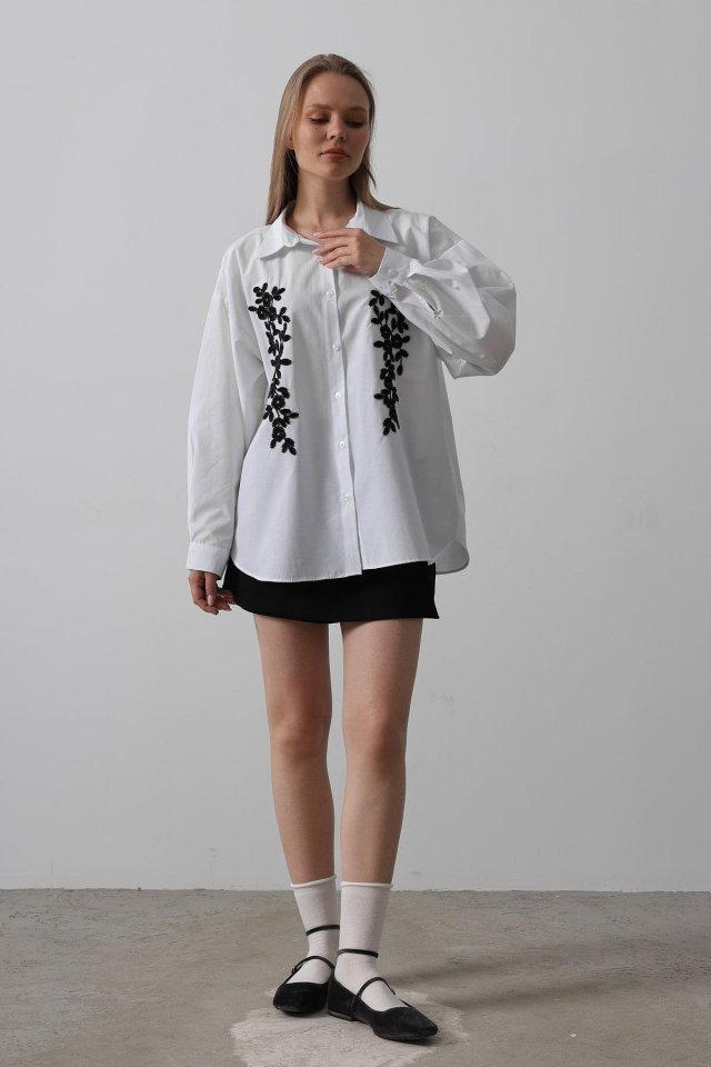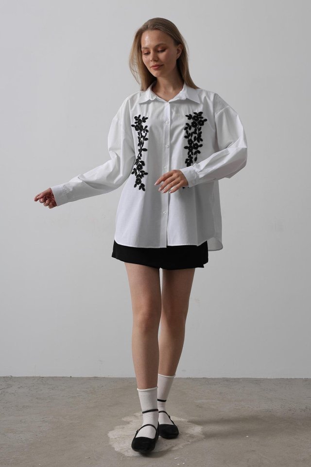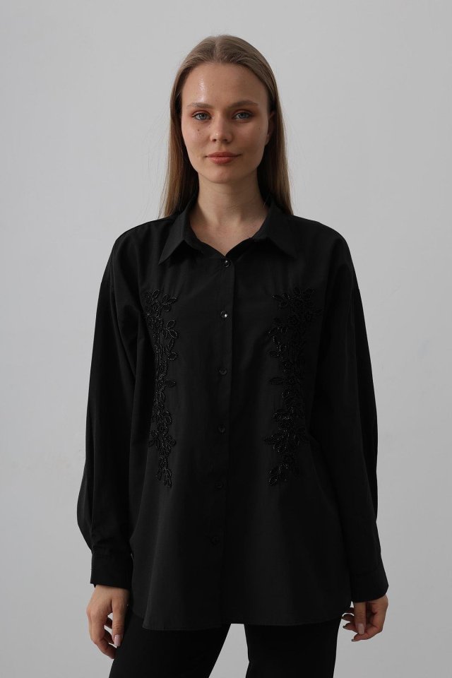 Boncuk Nakış Detaylı Uzun Gömlek - Siyah