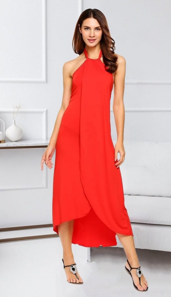 Boyun Askılı Eteği Kruvaze Kesim Viskon Kumaş Elbise