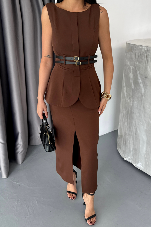 CEKET-ETEK GÖRÜNÜMLÜ ELBİSEÇİFT KEMER DETAYLI - Kahverengi