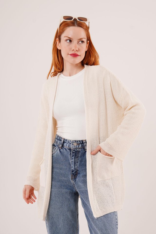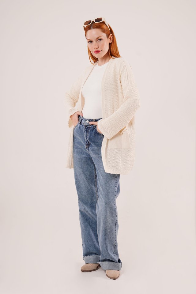 Cepli Salaş Model Triko Uzun Krem Hırka