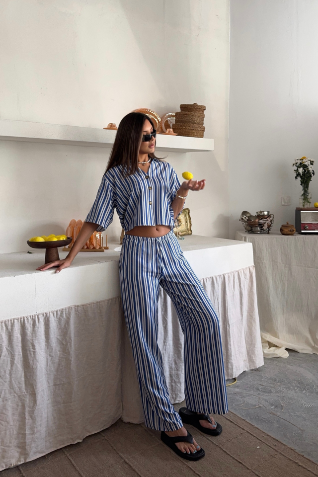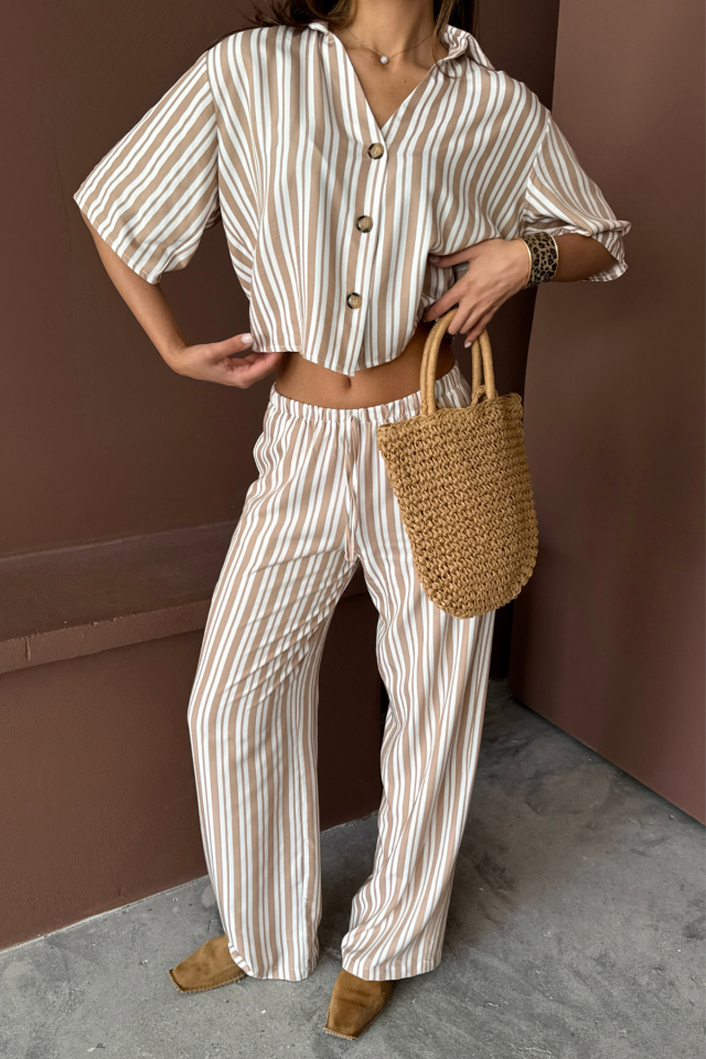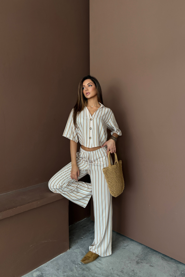 ÇİZGİLİ CROP GÖMLEK - SALAŞ PANTOLON TAKIM MODAL - Bej
