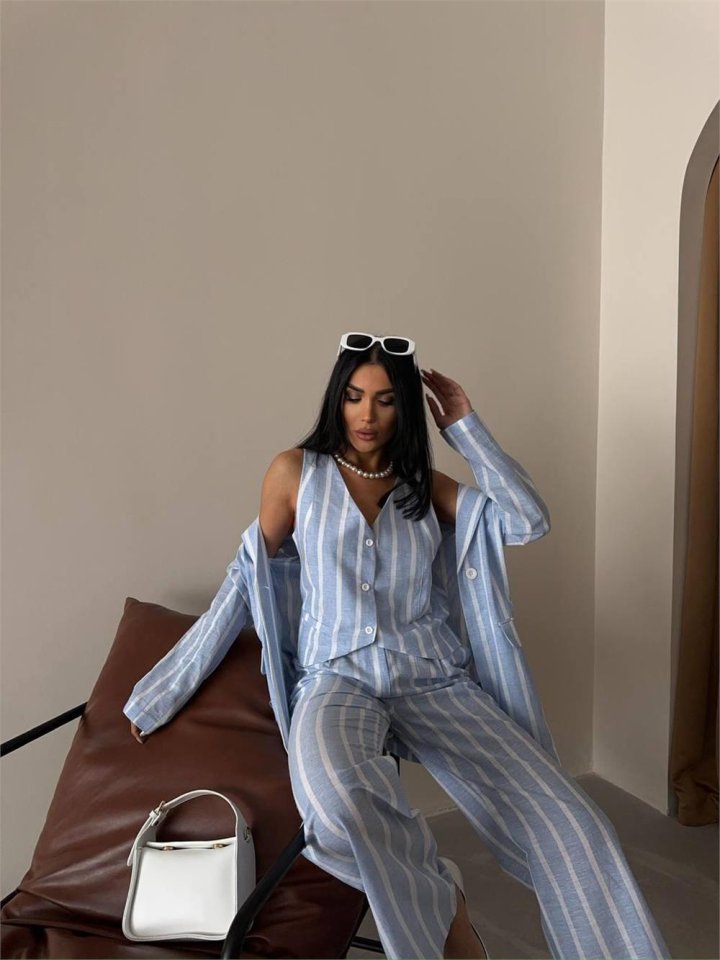 ÇİZGİLİ KETEN YELEK-PANTOLON TAKIM - Mavi