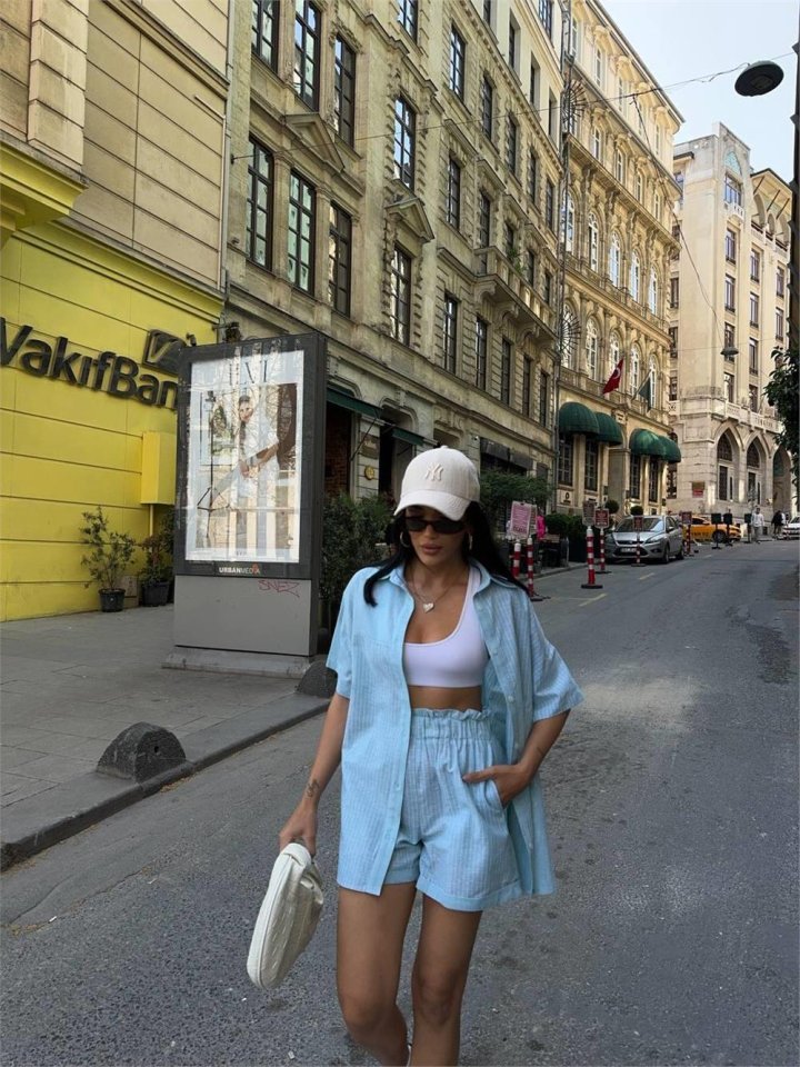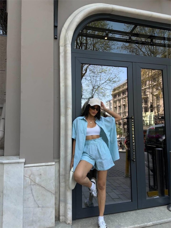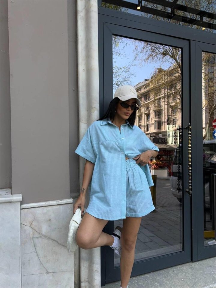 ÇİZGİLİ PARÇALI KETEN GÖMLEK-ŞORT TAKIM - Yeşil