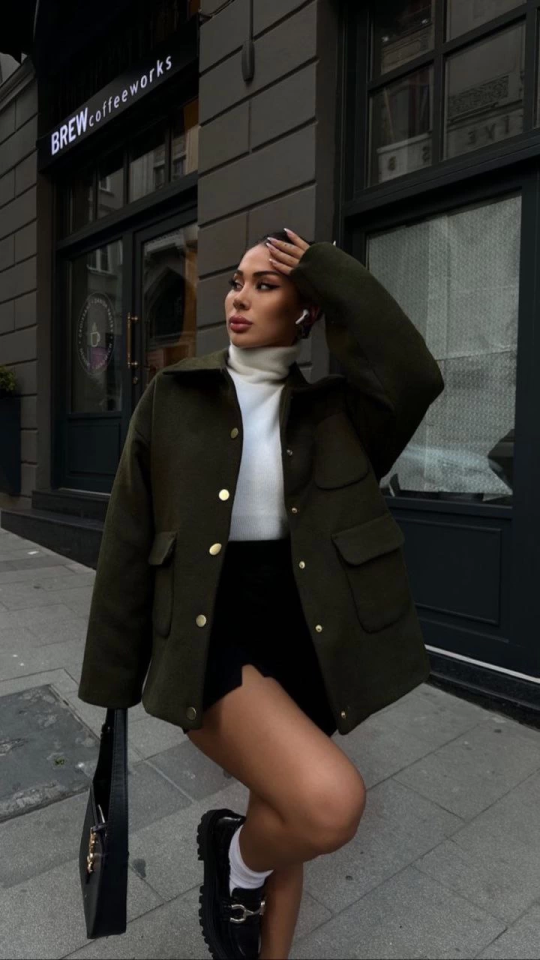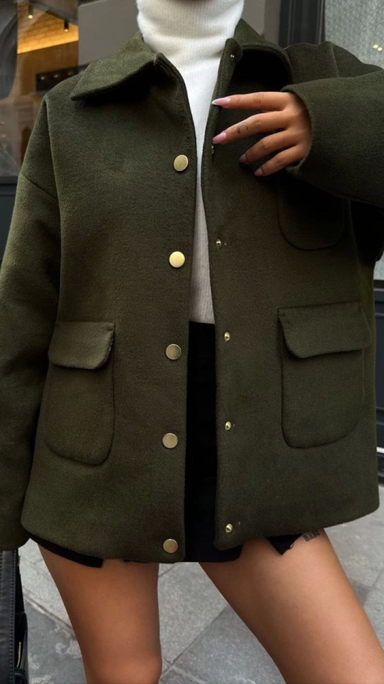 çıt çıt Kapama Kaşe Kaşmir Kumaş Cep Ve Düğme Detay Oversize Bleazer Bol Kesim Kalın Pinterest Ceket Mont - Haki