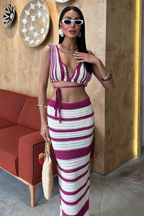 Çizgili Bikini Üst Ve Etek Triko Takım 10110