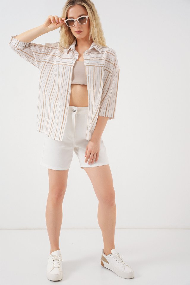 Çizgili Kısa Kol Gömlek 20344 - Krem