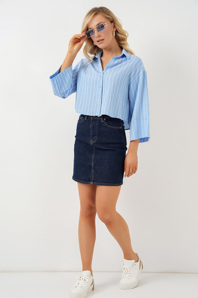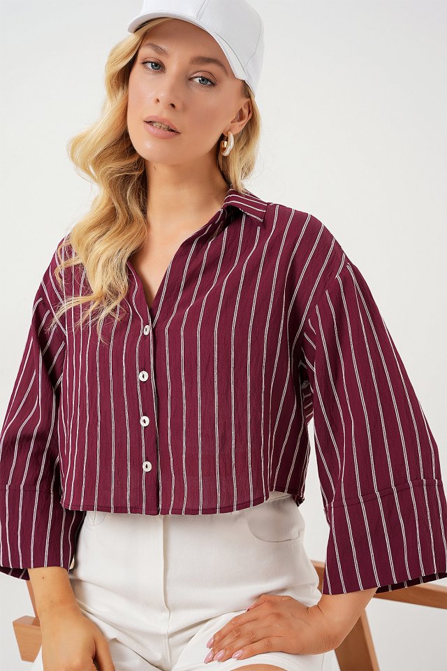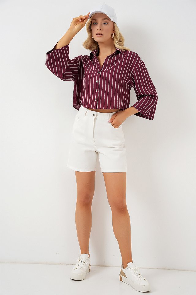 Çizgili Oversize Kısa Gömlek 20326 - Pembe