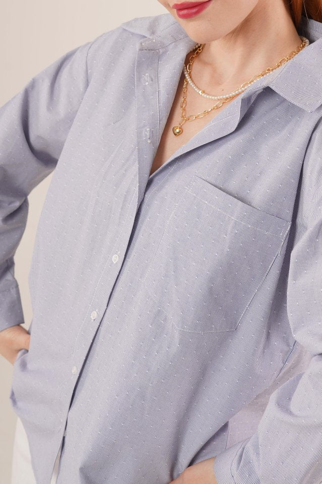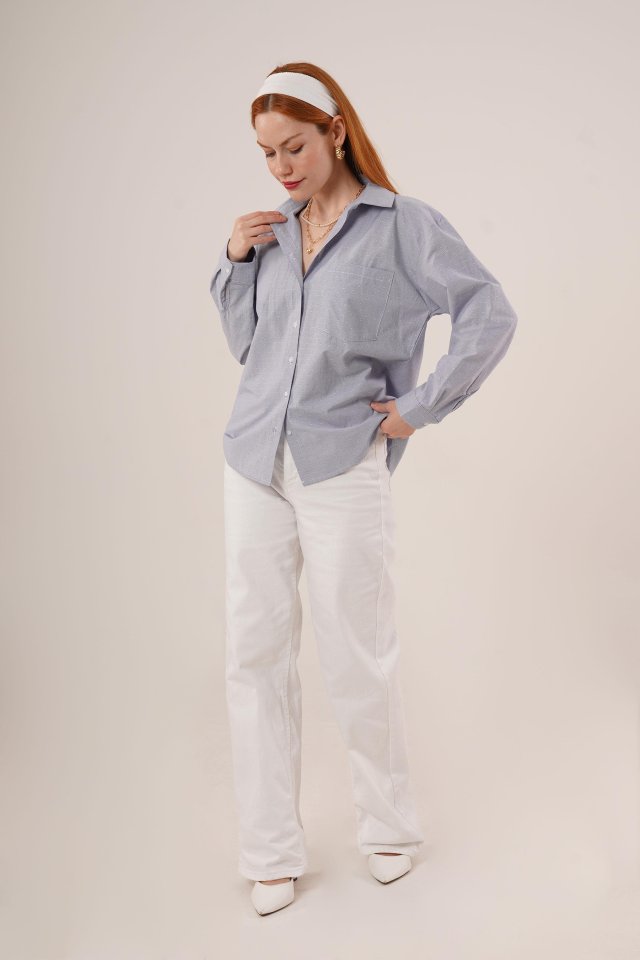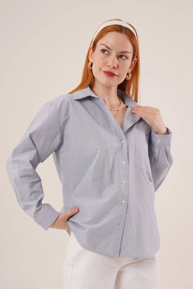 Çizgili Tek Cepli Klasik Kesim Düğmeli Mavi Gömlek