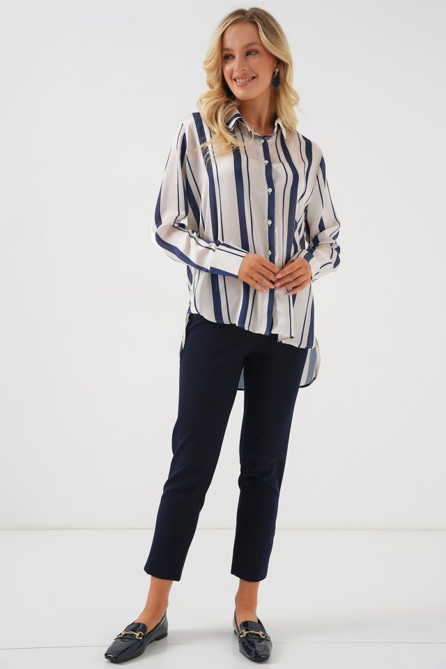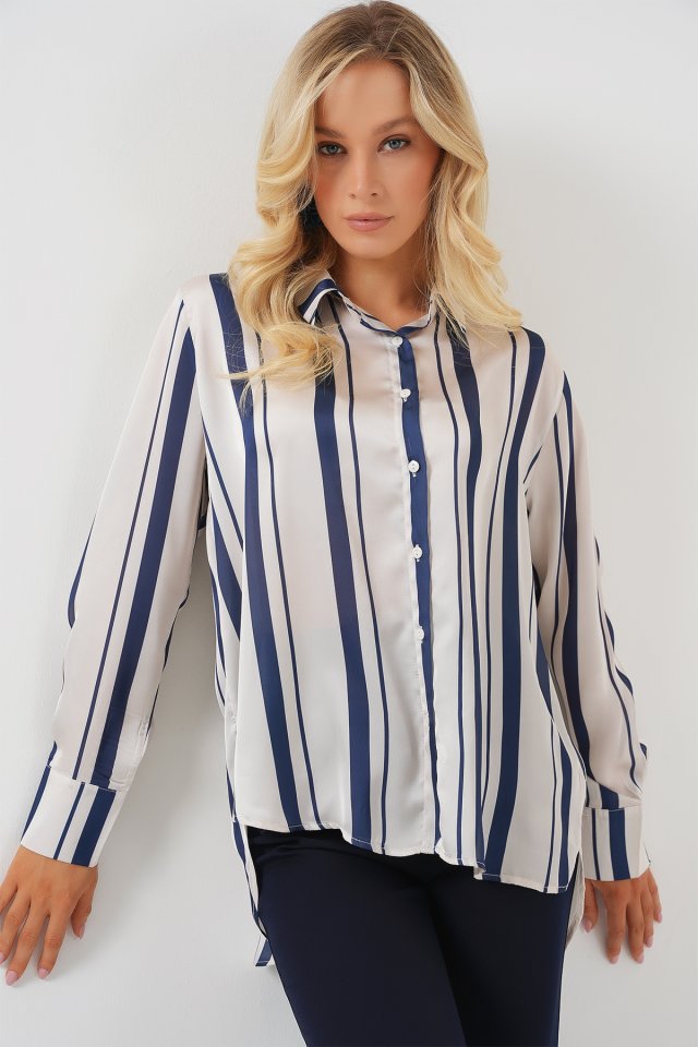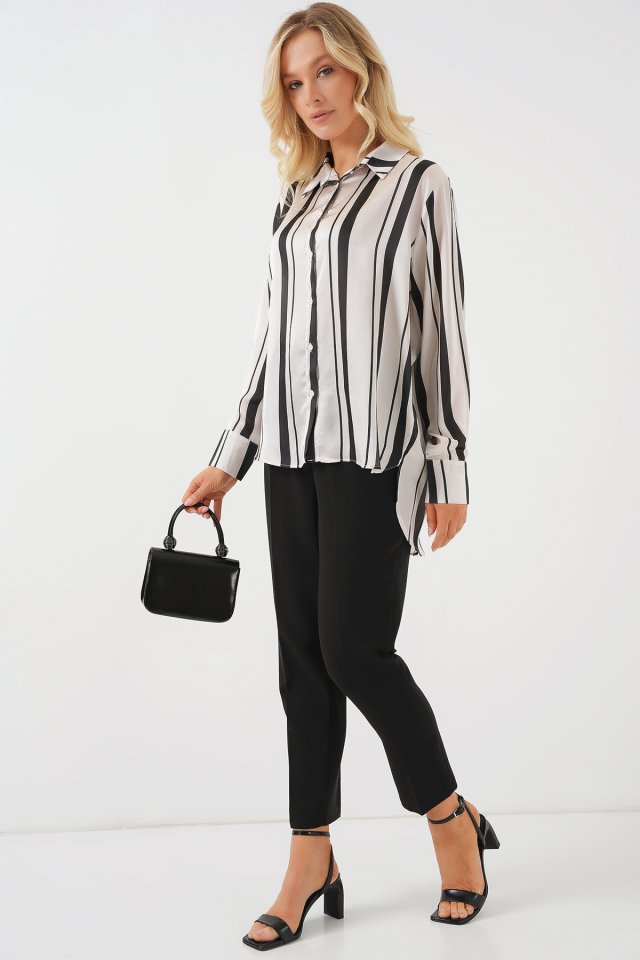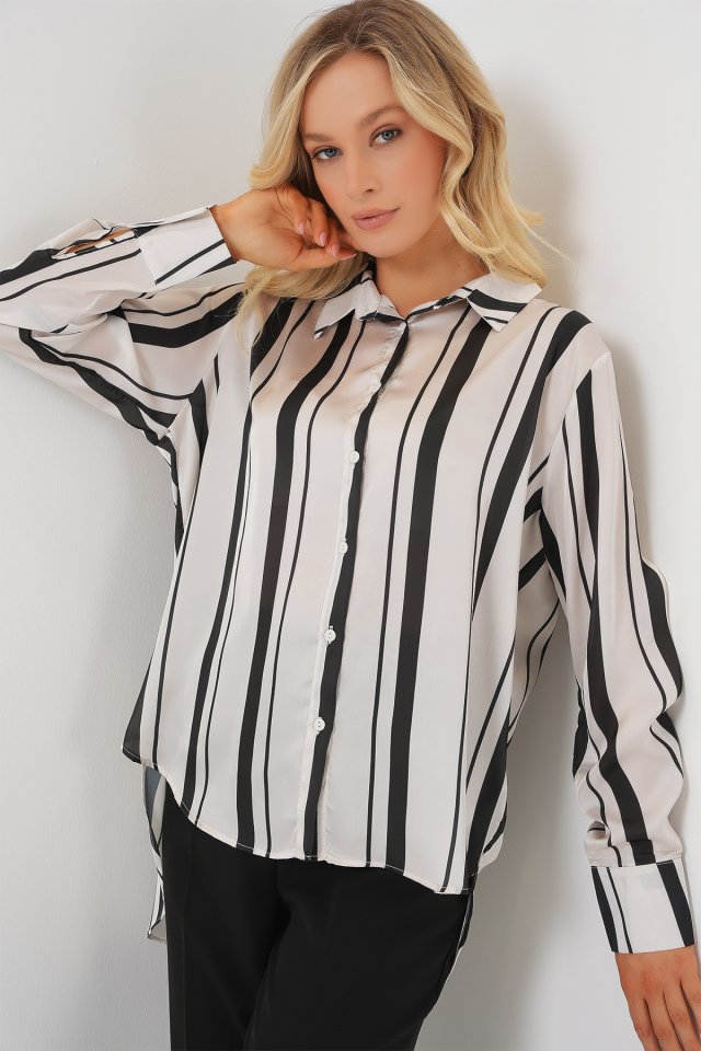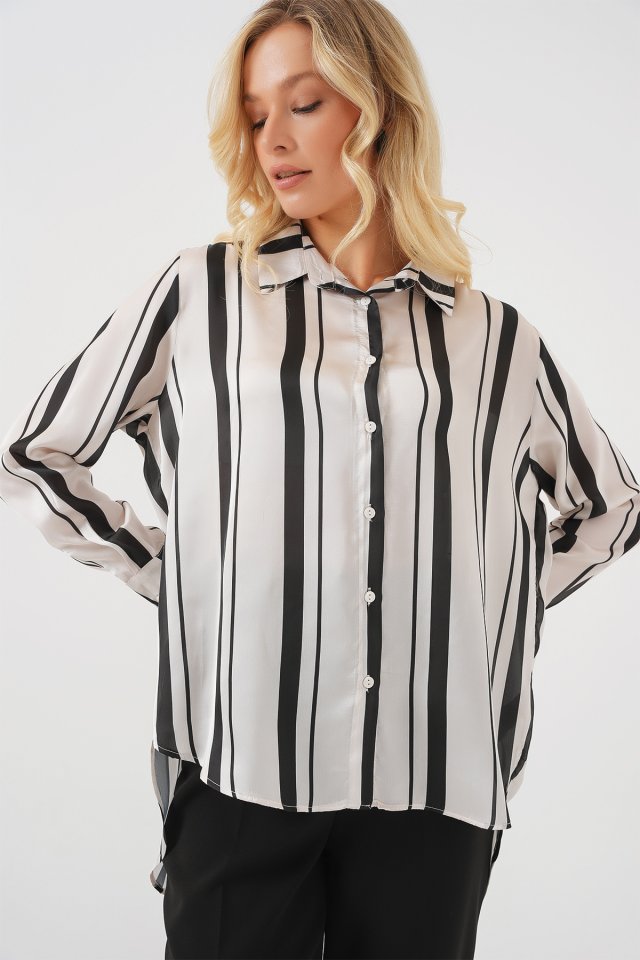 Çizgili Uzun Saten Gömlek 20291 - Siyah
