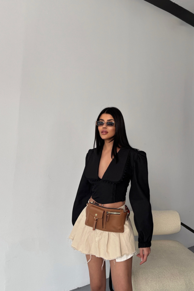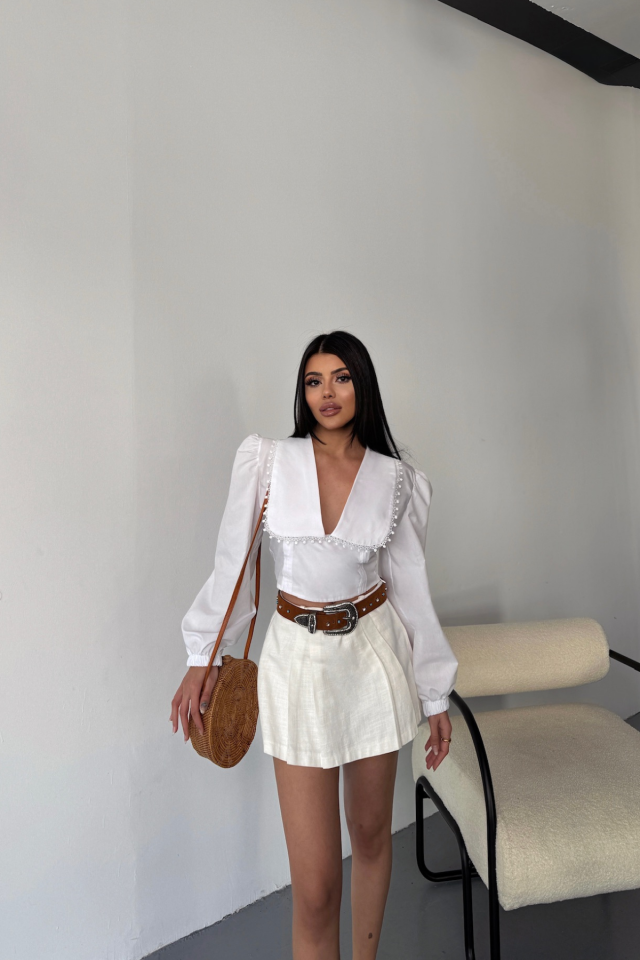 CROP POPLİN GÖMLEK YAKA KENAR DANTEL DETAYLI - Beyaz