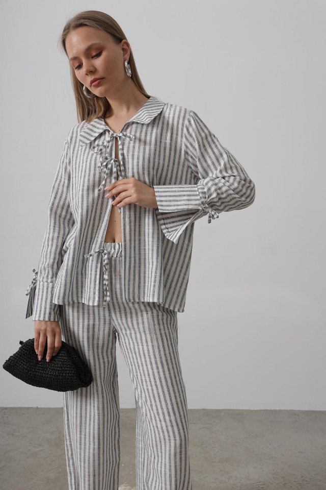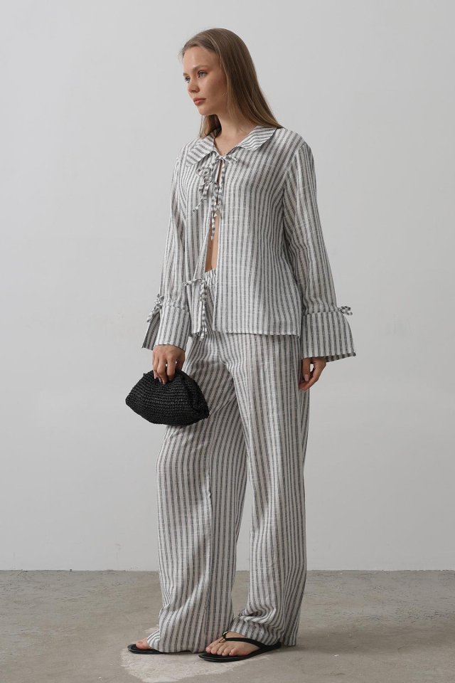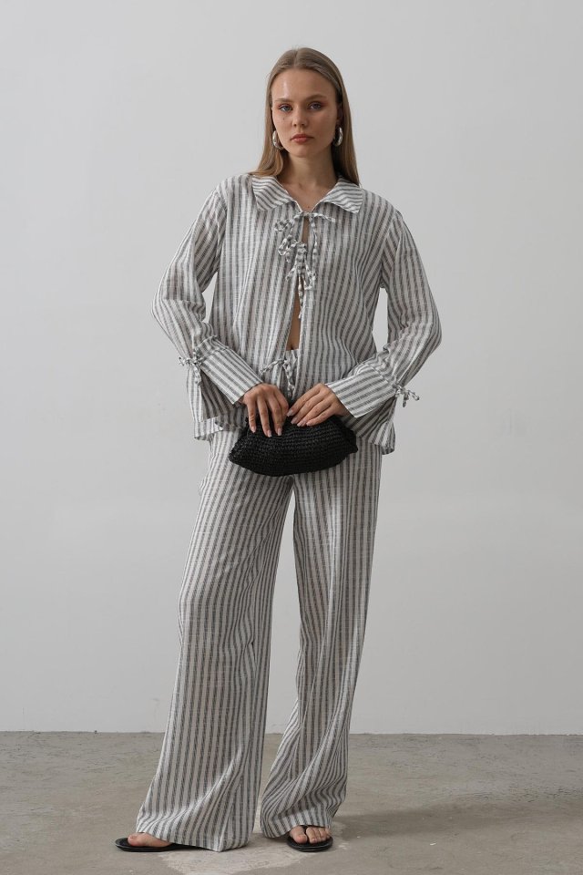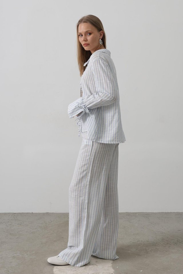 Çzgili Bağlamalı Pantolon Takım - Mavi