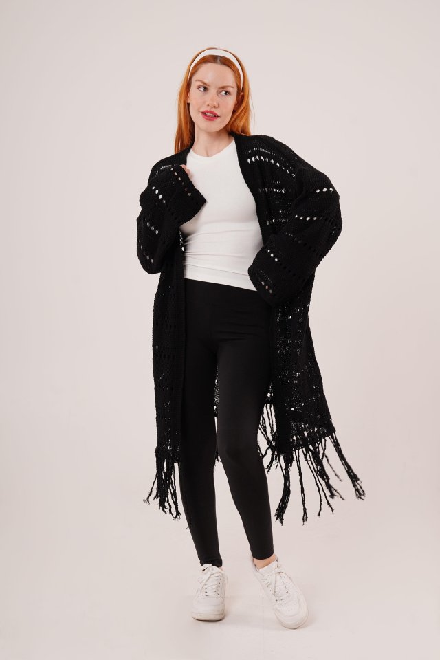Delikli Geçişli Püskül Detay Uzun Triko Krem Hırka