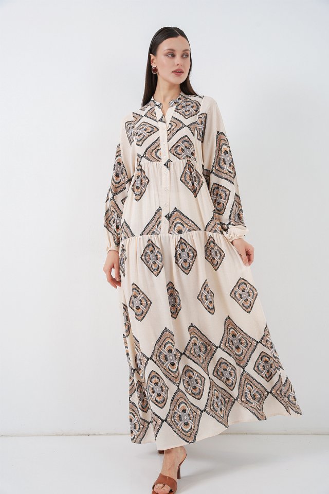 Desenli Uzun Tesettür Elbise 2585 - Ekru