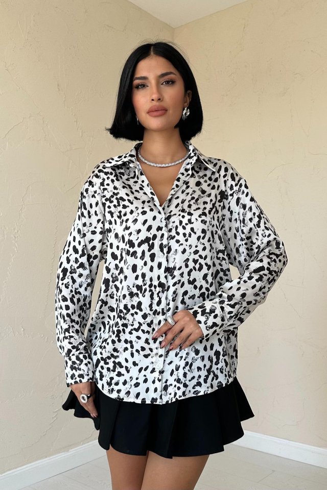 Ekru Leopar Desenli Saten Gömlek