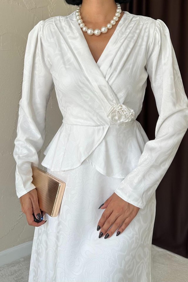 Ekru Pile Detaylı Kruvaze Elbise