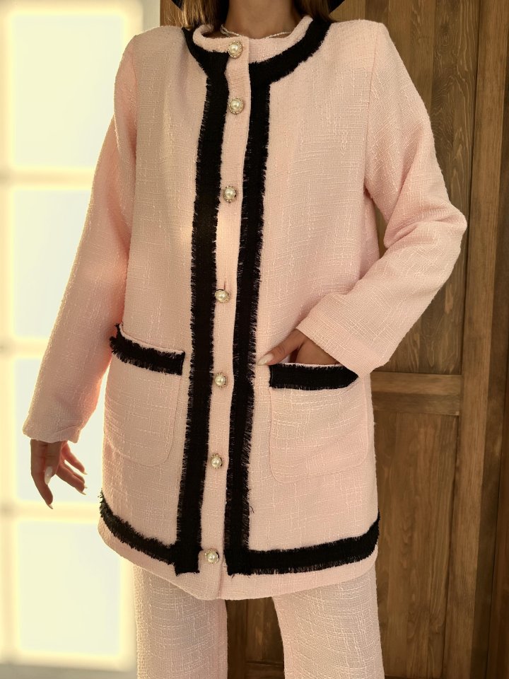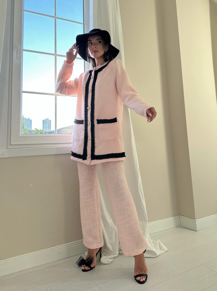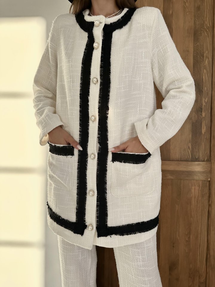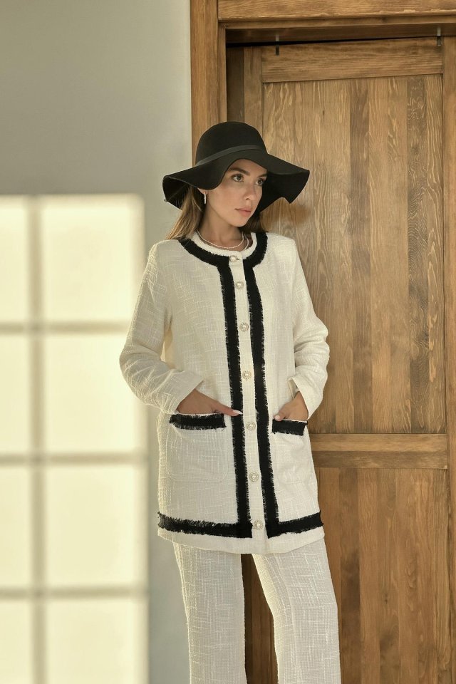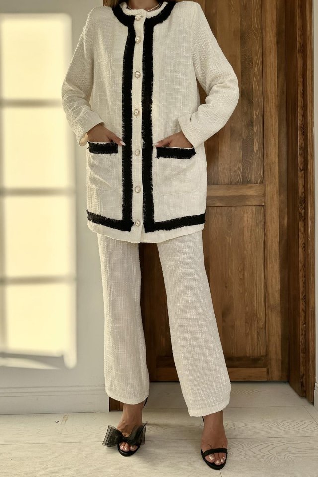 Ekru Siyah Şeritli Yakasız Ceket Ve Pantolon Takım