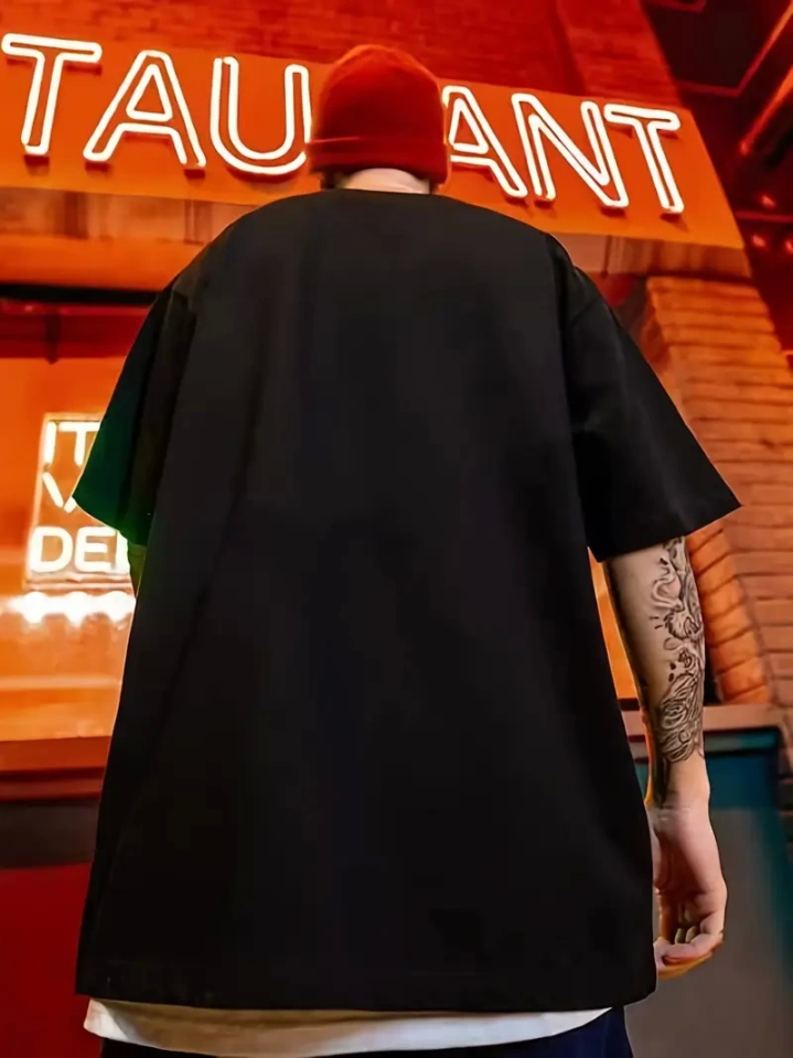 Erkek Büyük Beden Kart Baskılı Düz Renk Kısa Kollu Bisiklet Yaka Tişört Gündelik Giyim - Siyah