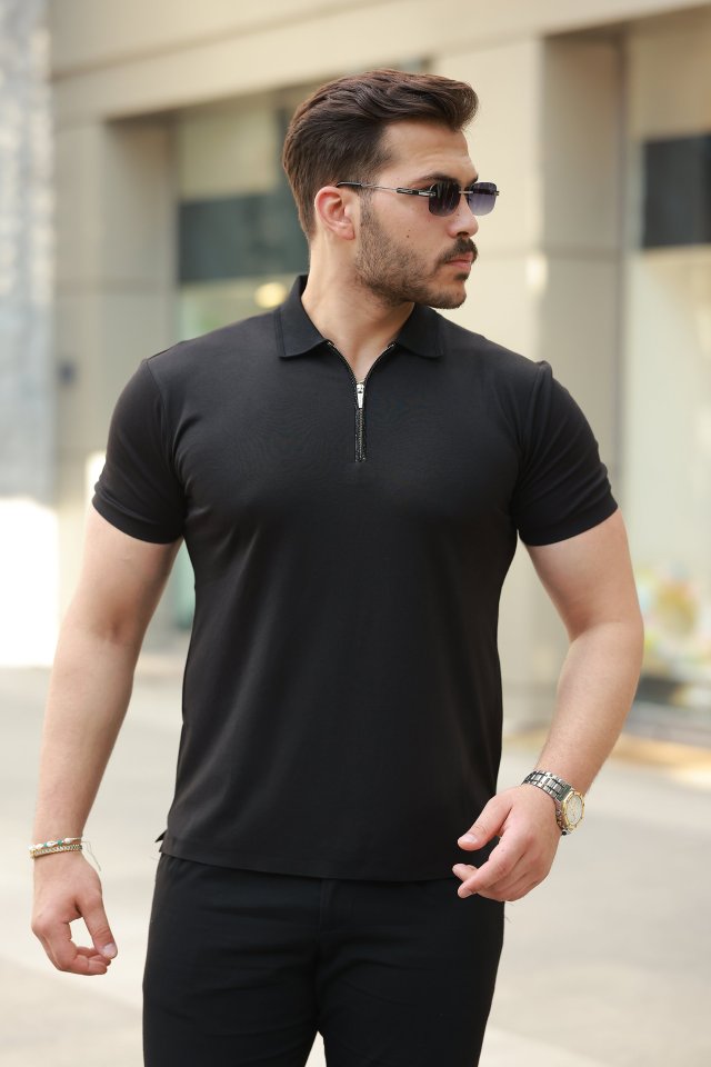 Erkek Deri Panel Detaylı Fermuar Yakalı Kısa Kollu Tişört