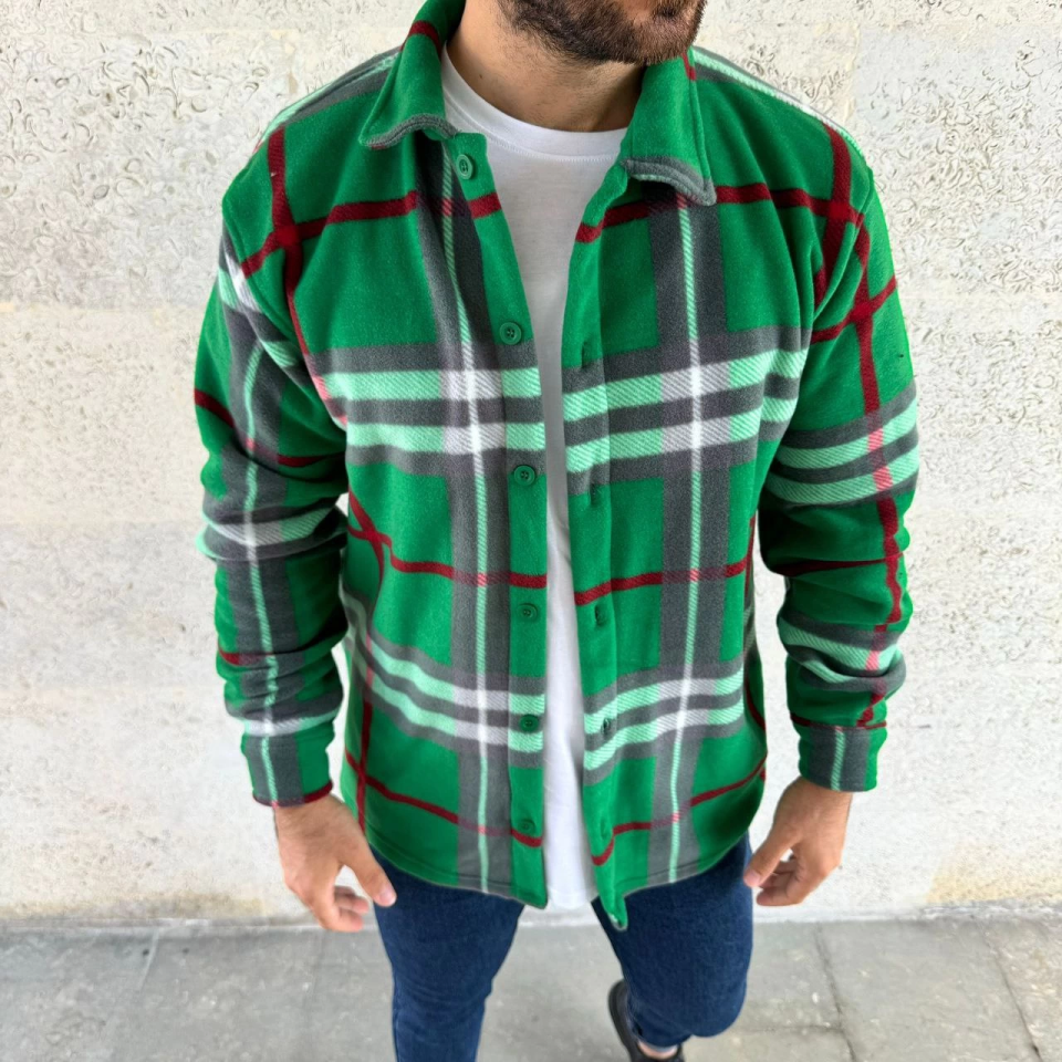 Erkek Ekose Desenli Düğmeli Polar Yakalı Uzun Kollu Gömlek Oversize Rahat Kalıp - Yeşil