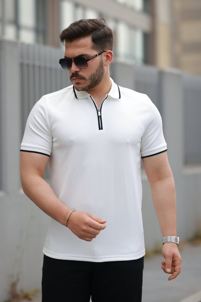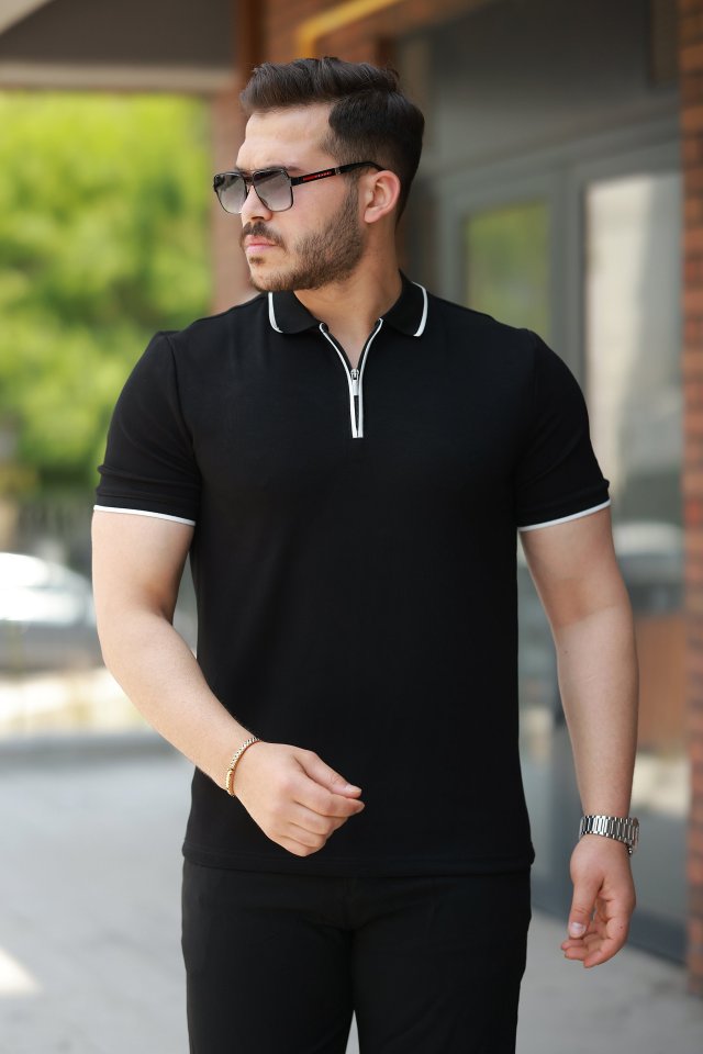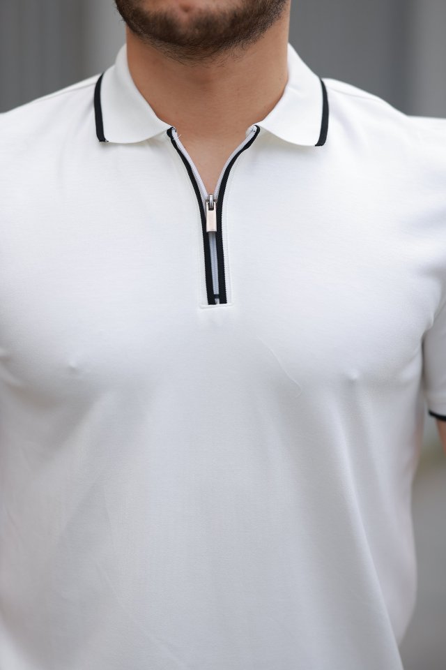 Erkek Fermuar Yakalı çizgi Detaylı Kısa Kollu Tişört