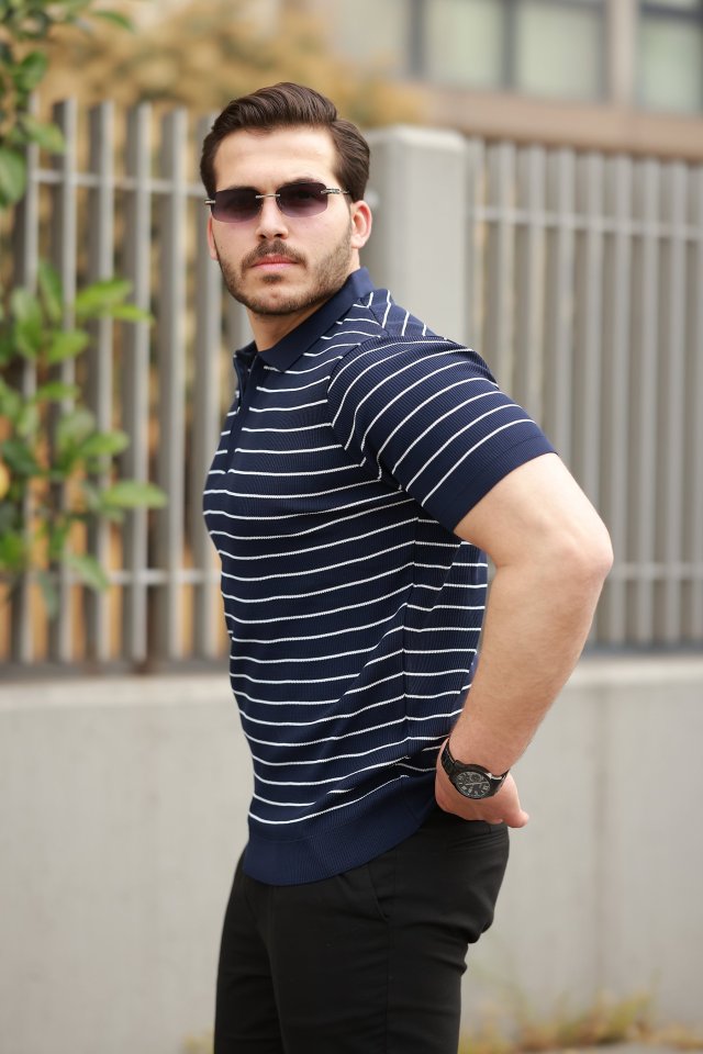 Erkek Fermuar Yakalı çizgili Kısa Kollu T-shirt
