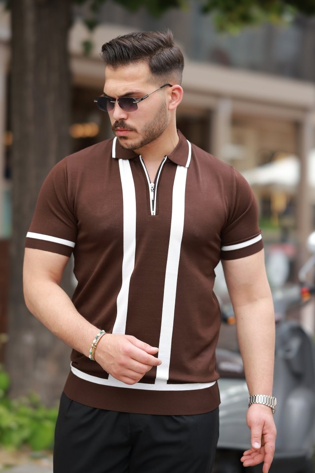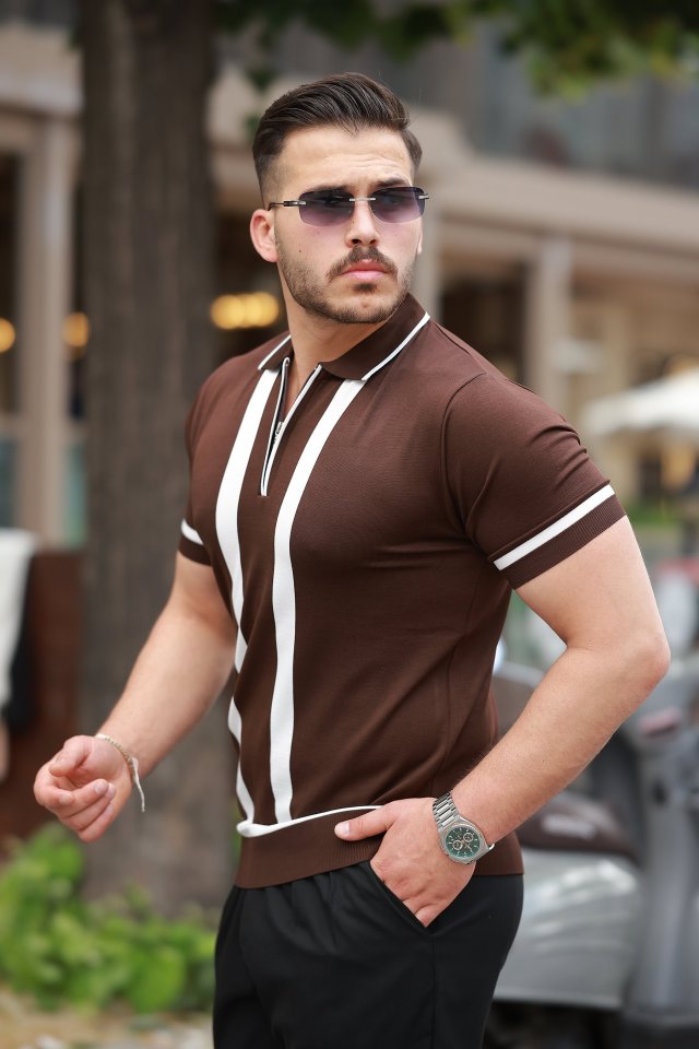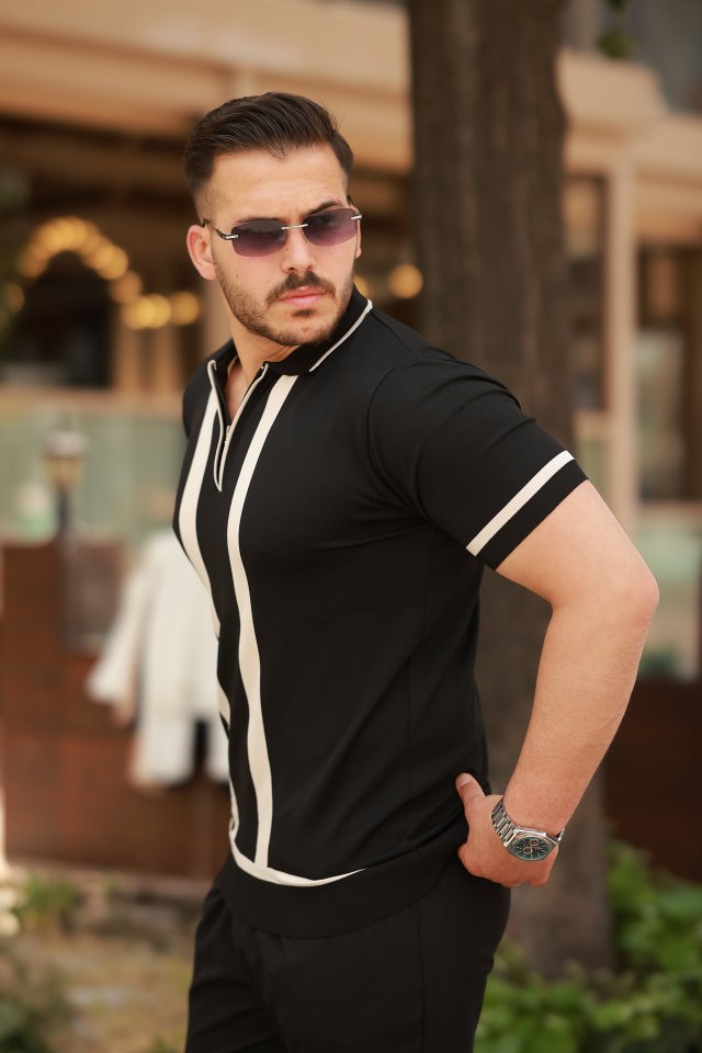 Erkek Fermuar Yakalı şerit Detaylı Kısa Kollu Tişört