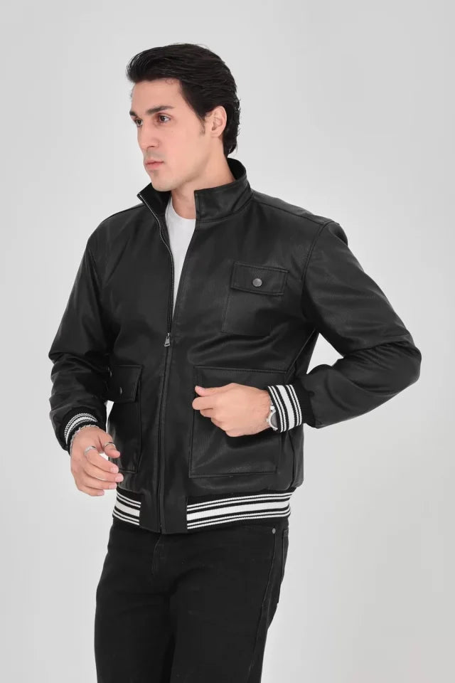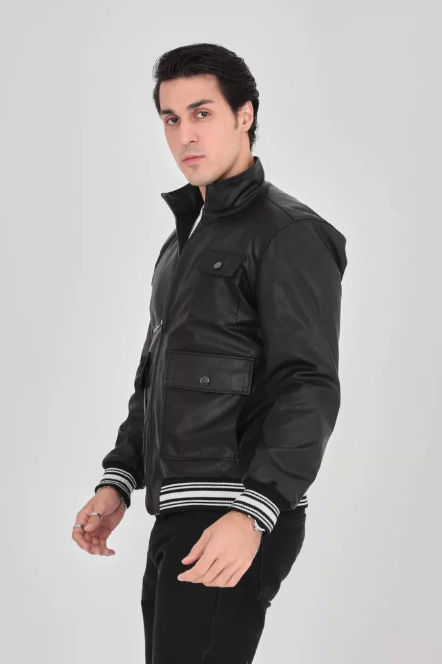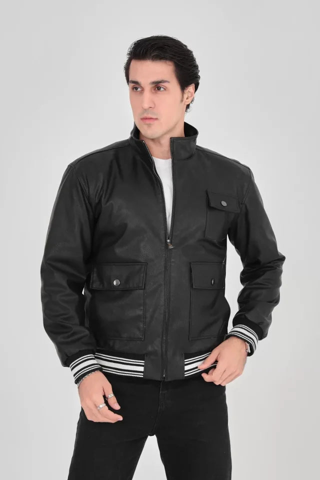 Erkek Fermuarlı İçten Elyaf Ve Astarlı Suni Deri Ceket - Siyah