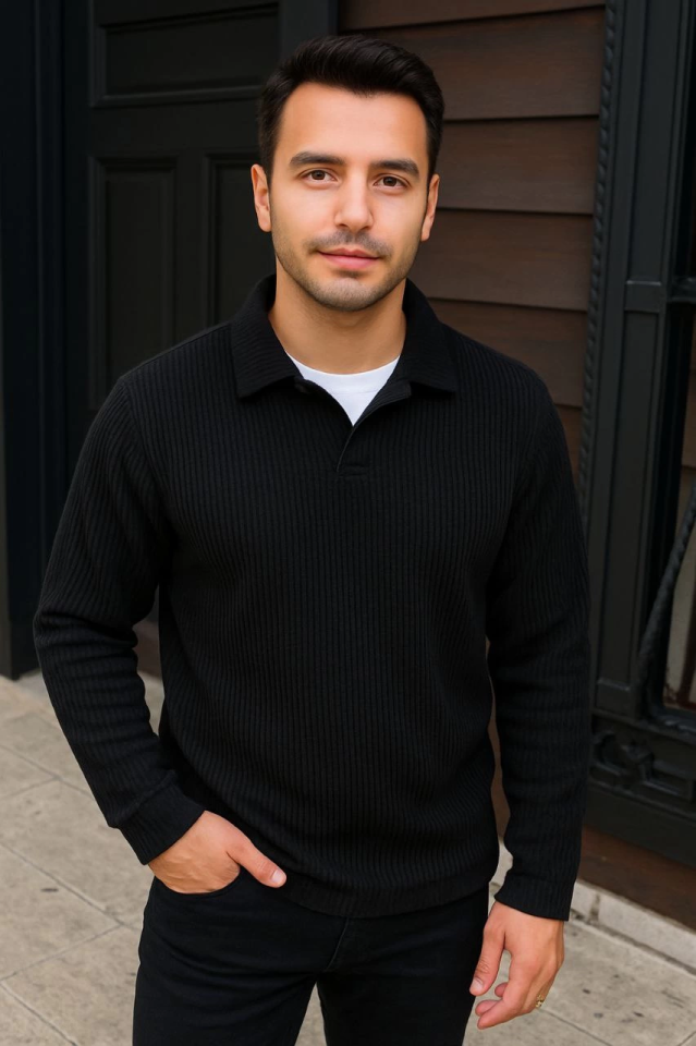 Erkek Fitilli Polar Sweatshirt – Düğmesiz Polo Yaka, Oversize Rahat Kalıp, Kalın Polar Kumaş, Kışlık Ve Baharlık Şık Günlük Üst - Siyah