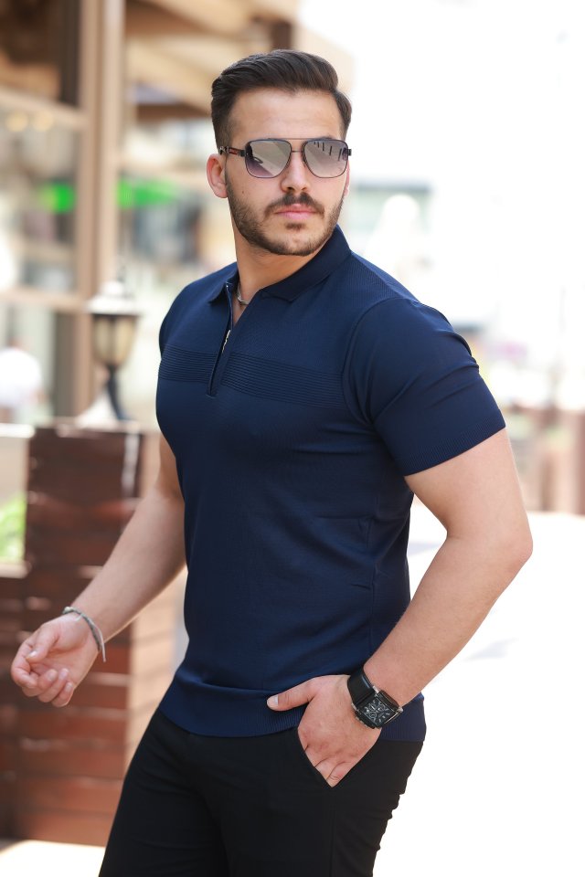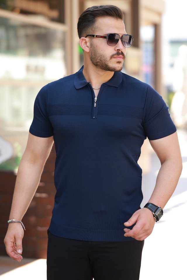 Erkek Göğüs Pirinç Desenli Fermuar Yakalı Kısa Kollu Tişört