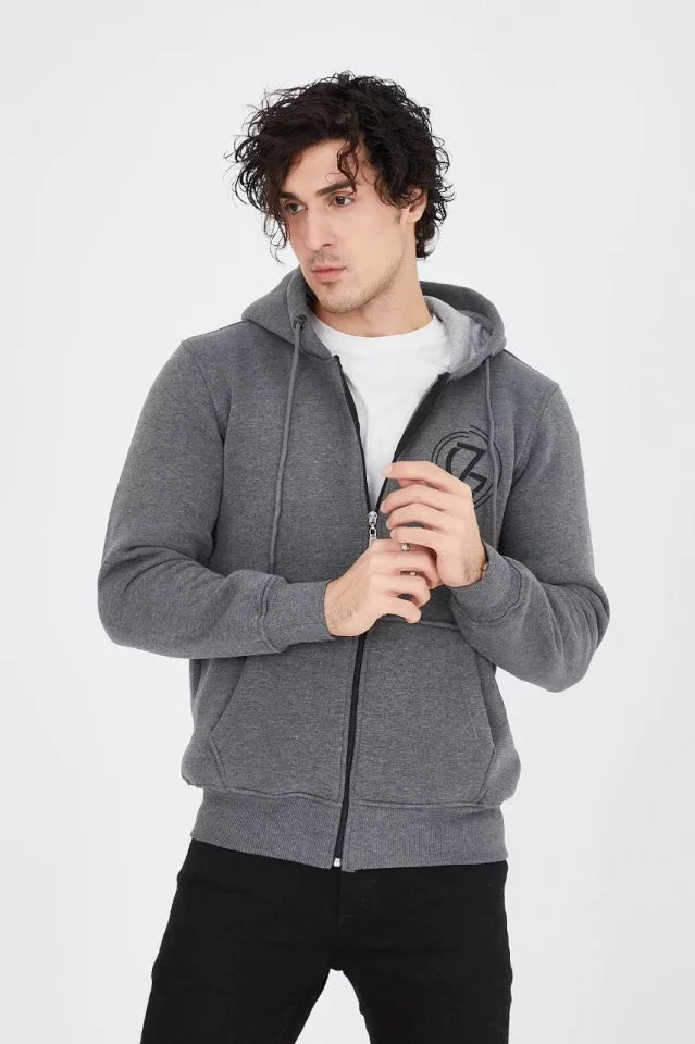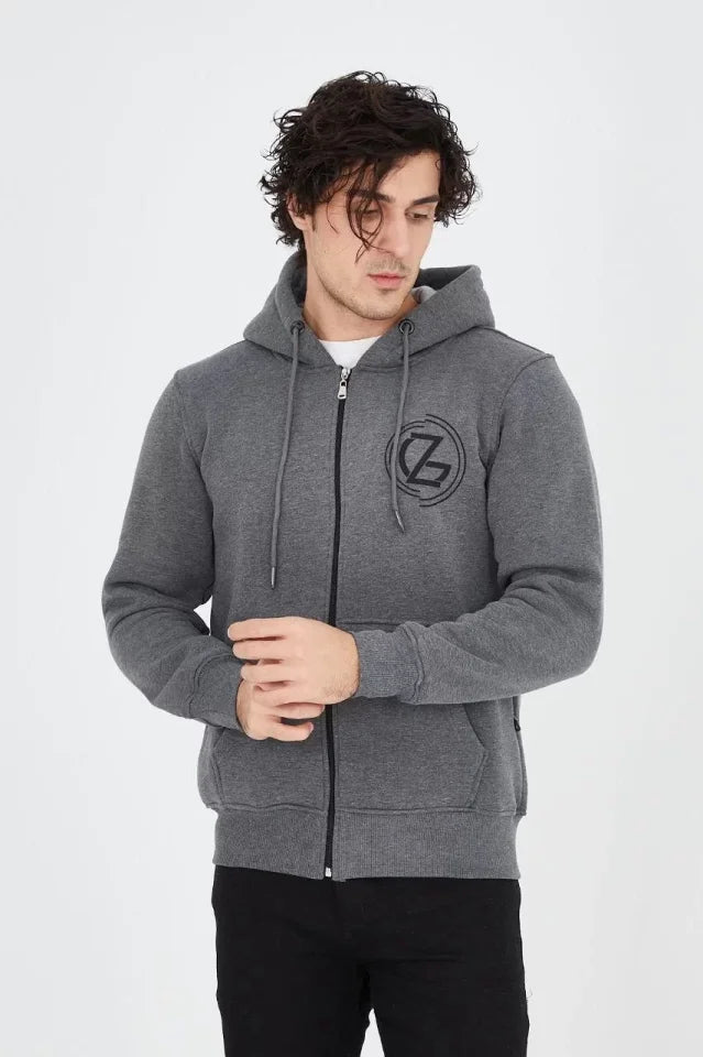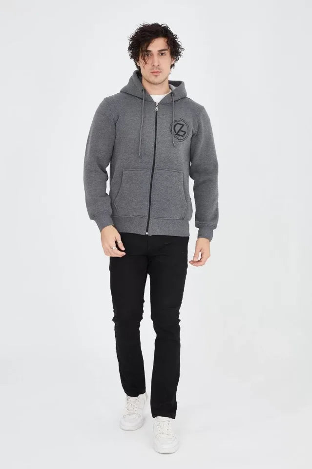 Erkek Kapüşonlu Baskılı Fermuarlı Hırka - Füme