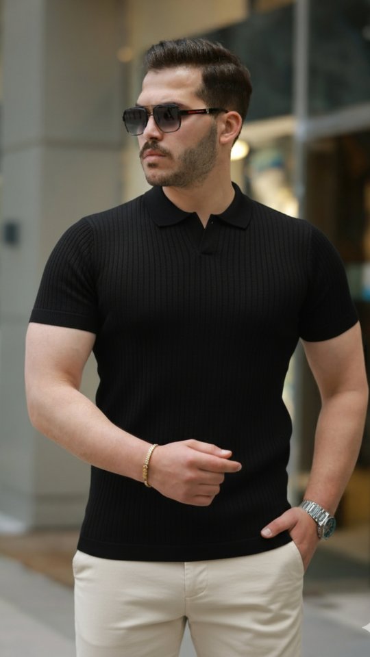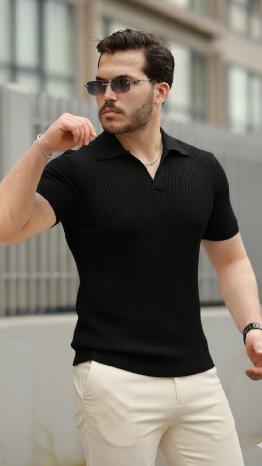 Erkek Kısa Kollu Yakalı çizgi Desenli Triko Bluz
