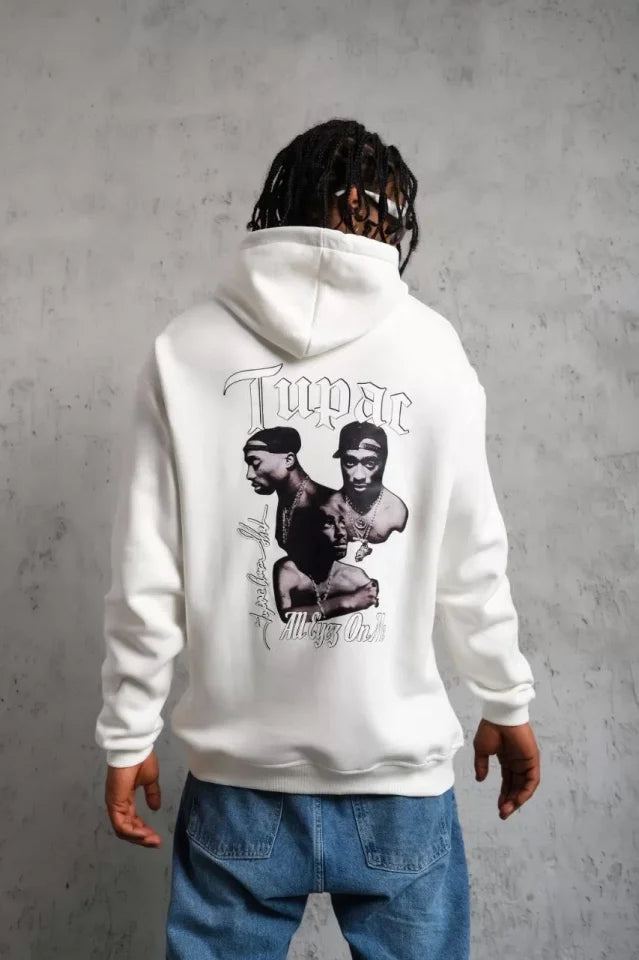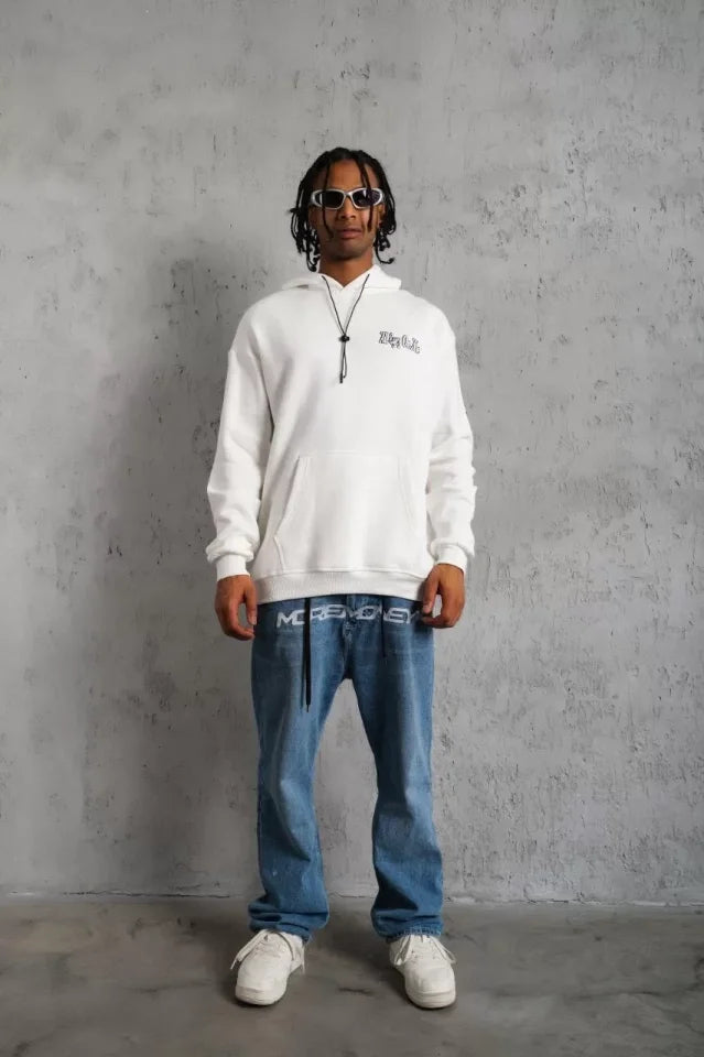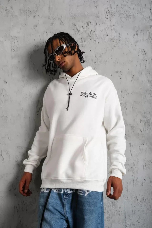 Erkek Kol Ve Etek Ribana Baskılı Kapüşonlu Sweat - Beyaz