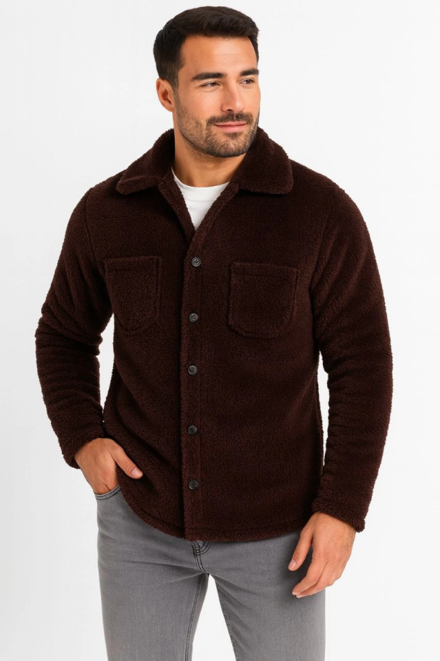 Erkek Pelüş Polar Hırka Gömlek – Yakalı, İlik Düğmeli, Göğüs Cepli, Yumuşak Dokulu Kışlık Regular Fit Rahat Günlük Model - Kahverengi