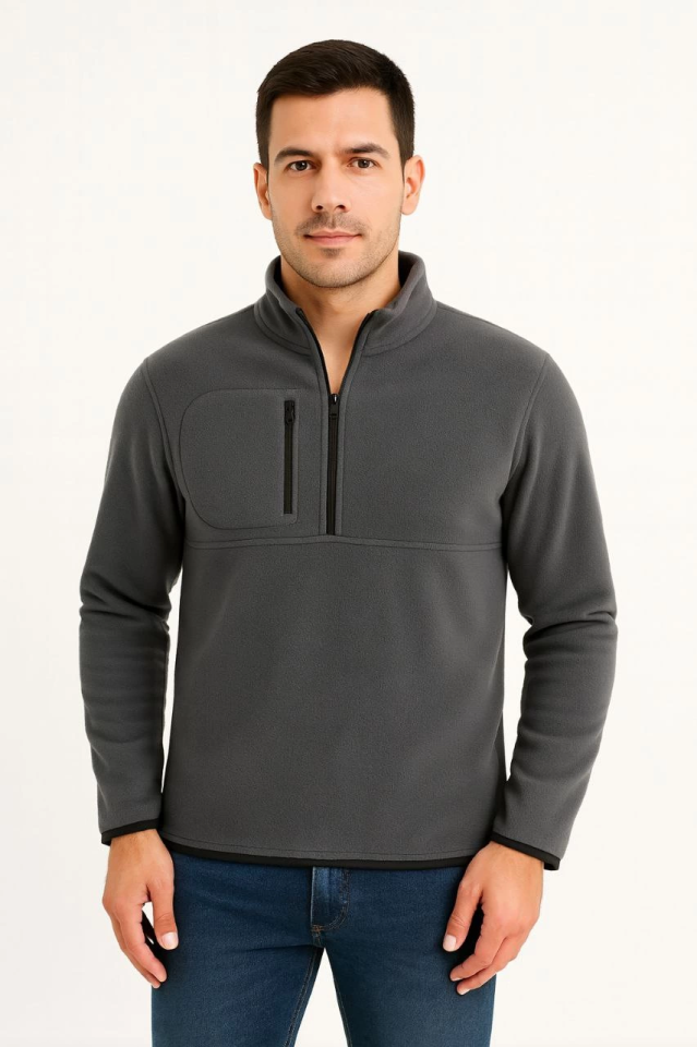 Erkek Polar Kazak – Dik Yaka, Yarım Fermuarlı, Fermuarlı Göğüs Cepli, Siyah Biyeli, Kışlık Rahat Regular Fit Günlük Model - Füme