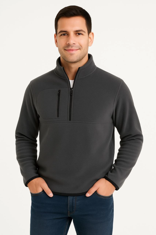 Erkek Polar Kazak – Dik Yaka, Yarım Fermuarlı, Fermuarlı Göğüs Cepli, Siyah Biyeli, Kışlık Rahat Regular Fit...
